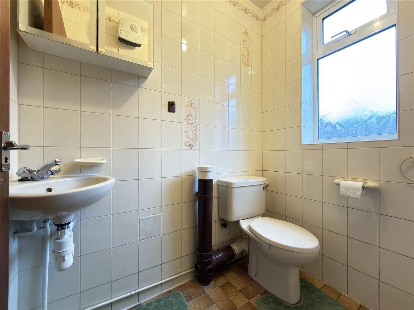 Tiled flooring and tiled walls with a panelled ceiling. The bathroom includes a standing radiator, toilet, wash hand basin, and a panelled bath with mixer function. A double-glazed window faces the rear aspect. There is also a storage cupboard accommodating a newly installed gas-powered combination boiler.
