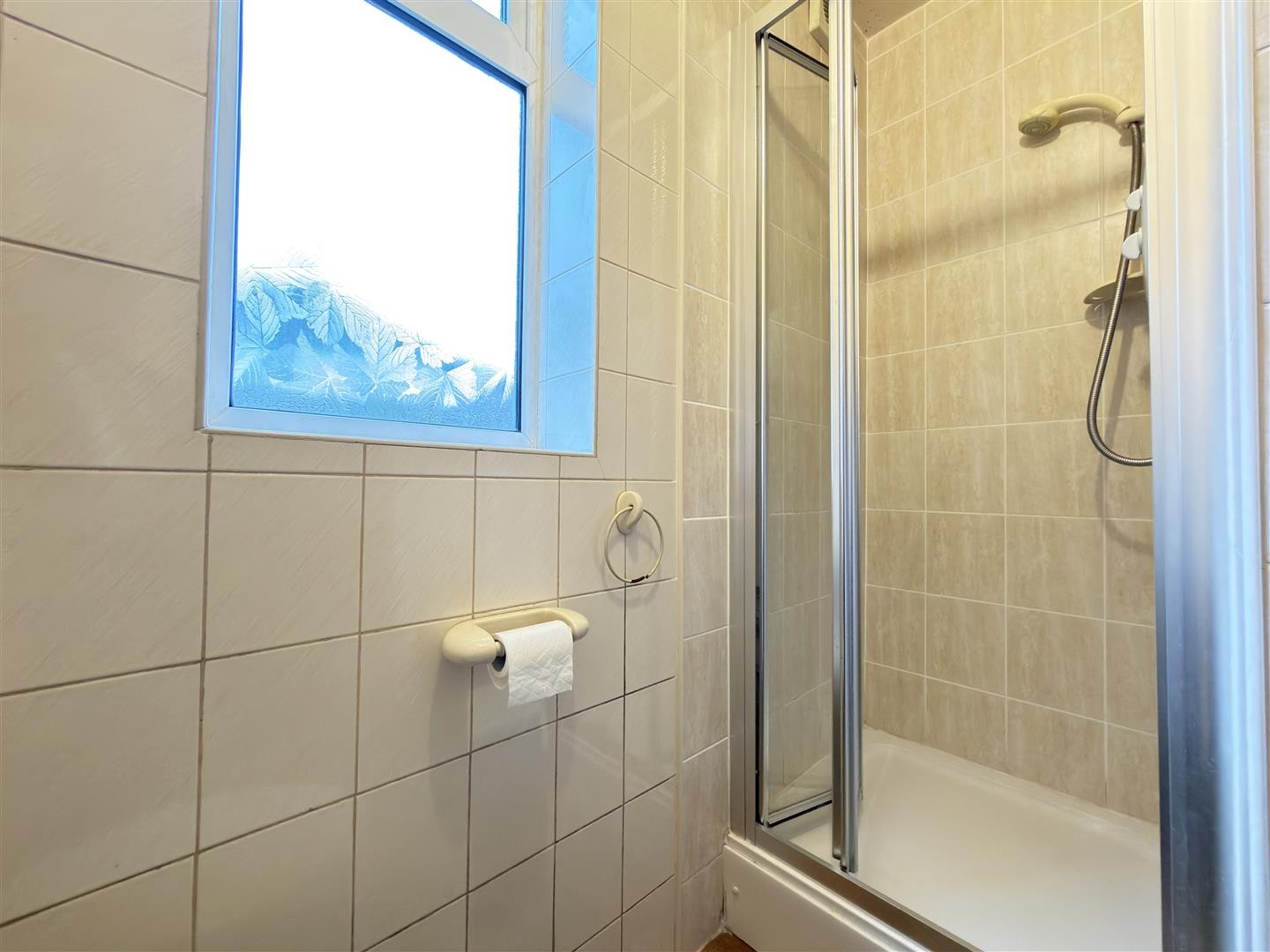Tiled flooring and fully tiled walls, comprising a wash hand basin, toilet, and a stand-up shower cubicle with electric function. A double-glazed window faces the rear aspect.