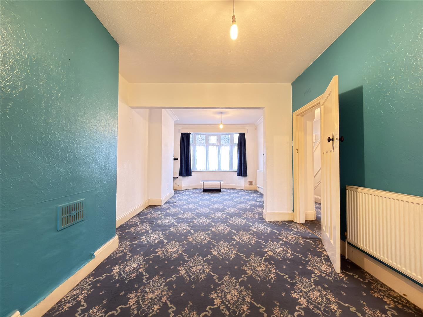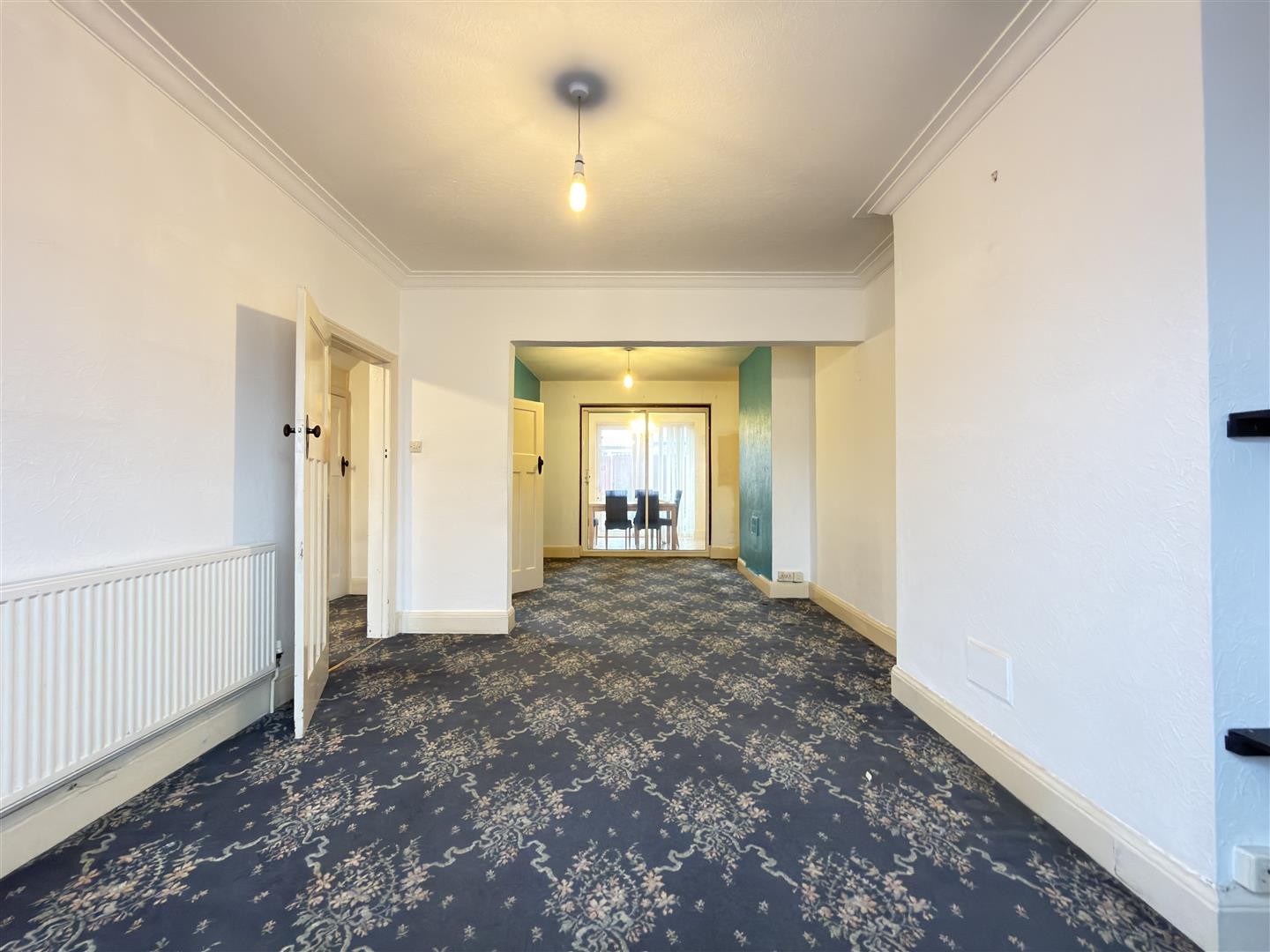 Carpeted flooring with a radiator and sliding double-glazed doors providing access into the kitchen/diner.