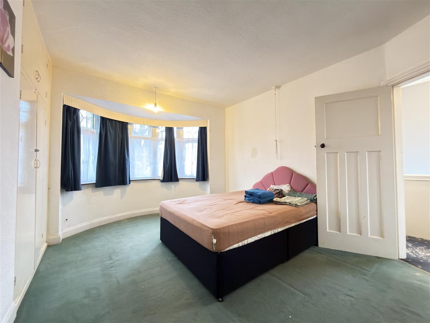Carpeted flooring with a radiator, inbuilt storage cupboard, and a double-glazed bay window facing the front aspect.