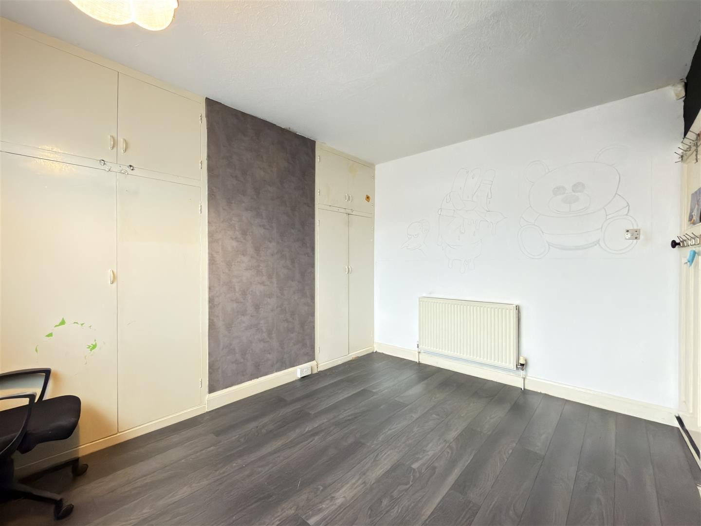 Laminate flooring with a radiator, inbuilt storage cupboard, and a double-glazed window facing the rear aspect.