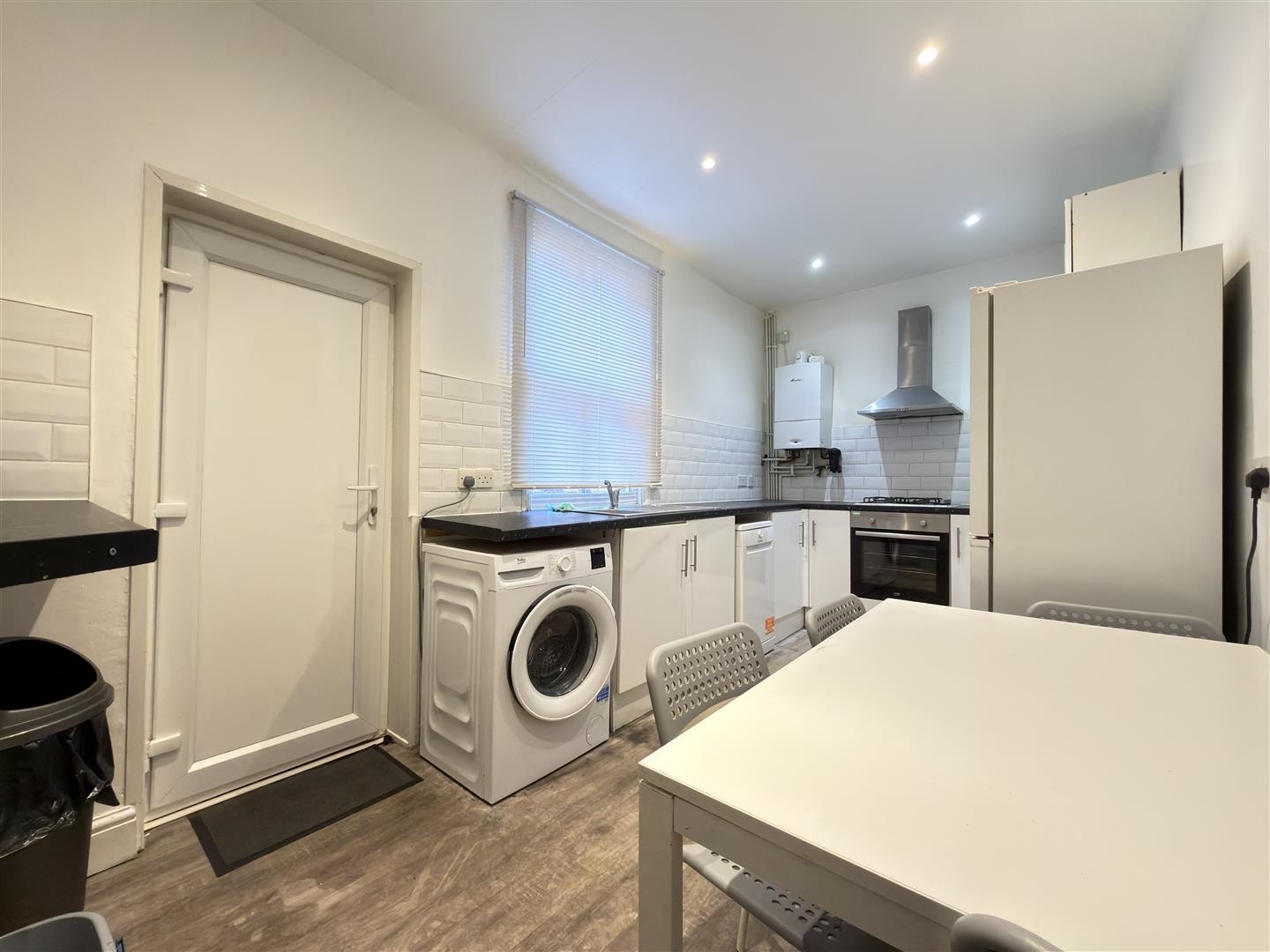 Vinyl flooring, storage cupboard located under the stairs, dining area, radiator, UPVC door allowing access into the garden, partially tiled walls, base level and eye-level units, space and plumbing for a washing machine, stainless steel sink, double glazed window facing the side aspect, space and plumbing for a dishwasher, gas powered combination boiler, spotlighting, integrated four-ring gas burner with oven and extractor over, and space for a fridge.