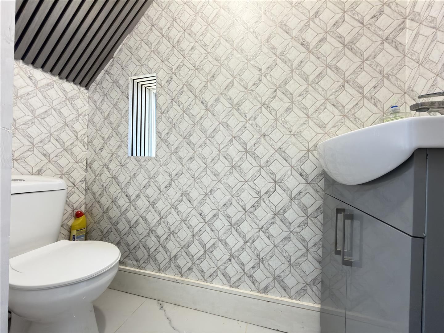 Tiled flooring, wash hand basin, WC, double-glazed window to the side aspect.