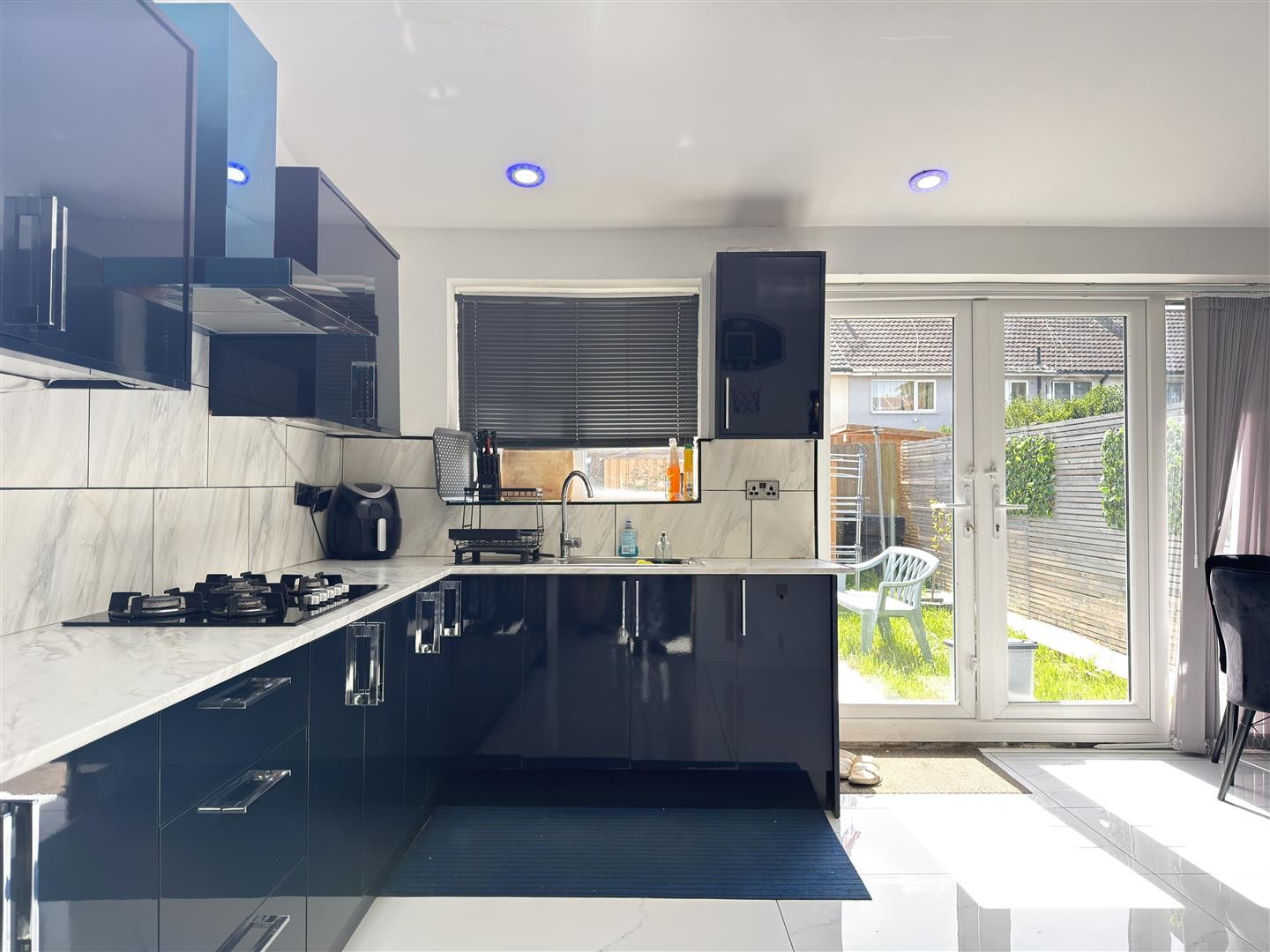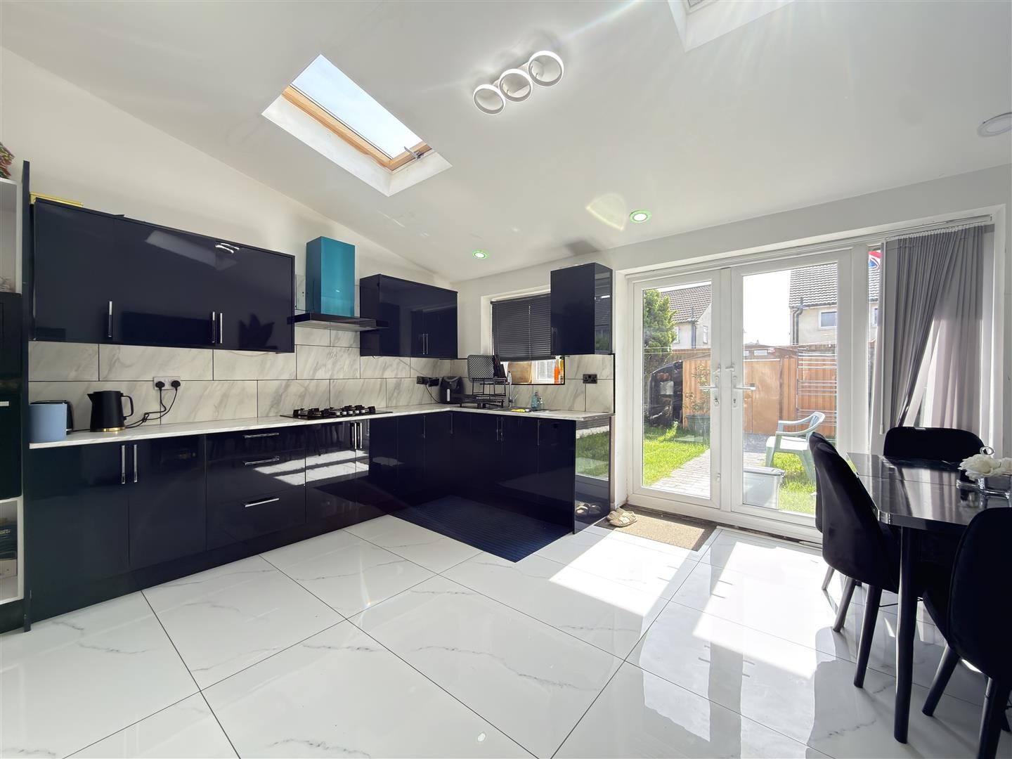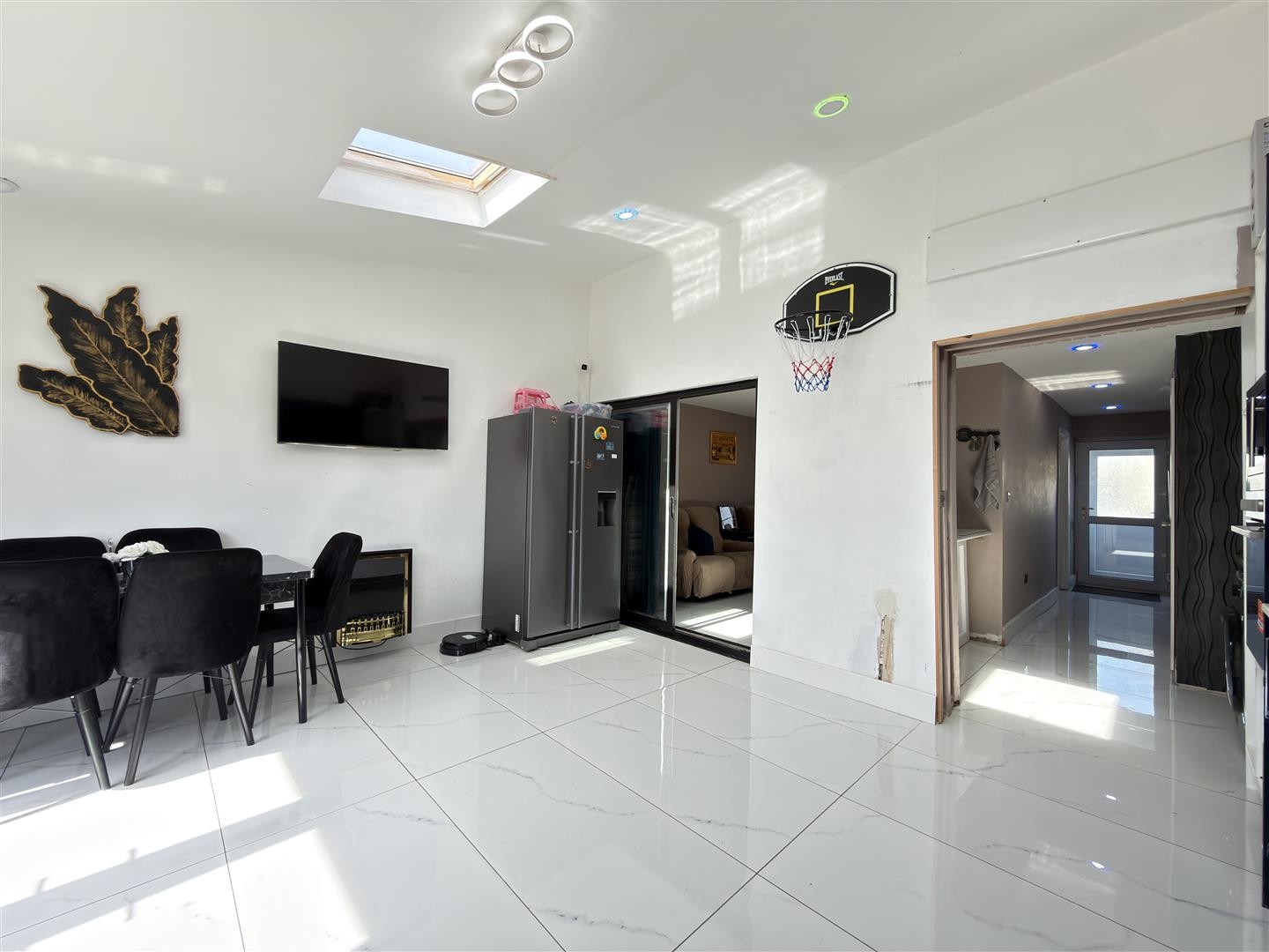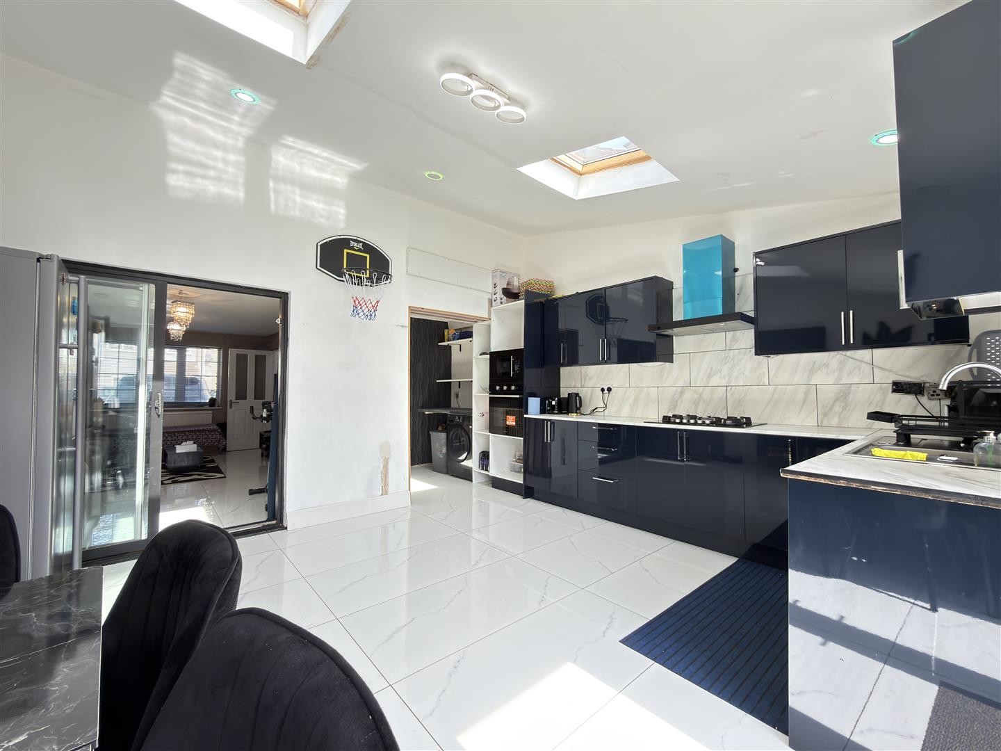 Tiled flooring, spotlighting, space for fridge, dining area, Velux double-glazed windows, bi-fold uPVC doors providing access to the rear garden.