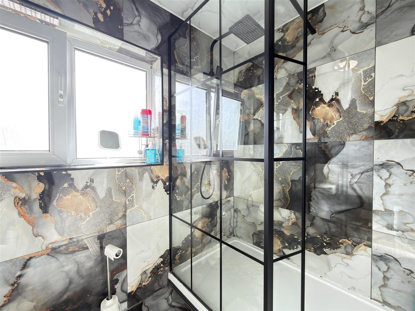 Tiled flooring, tiled walls, panelled ceiling, standing radiator, large shower cubicle with mixer function and rain head, wash hand basin, WC, double-glazed window to the rear aspect.