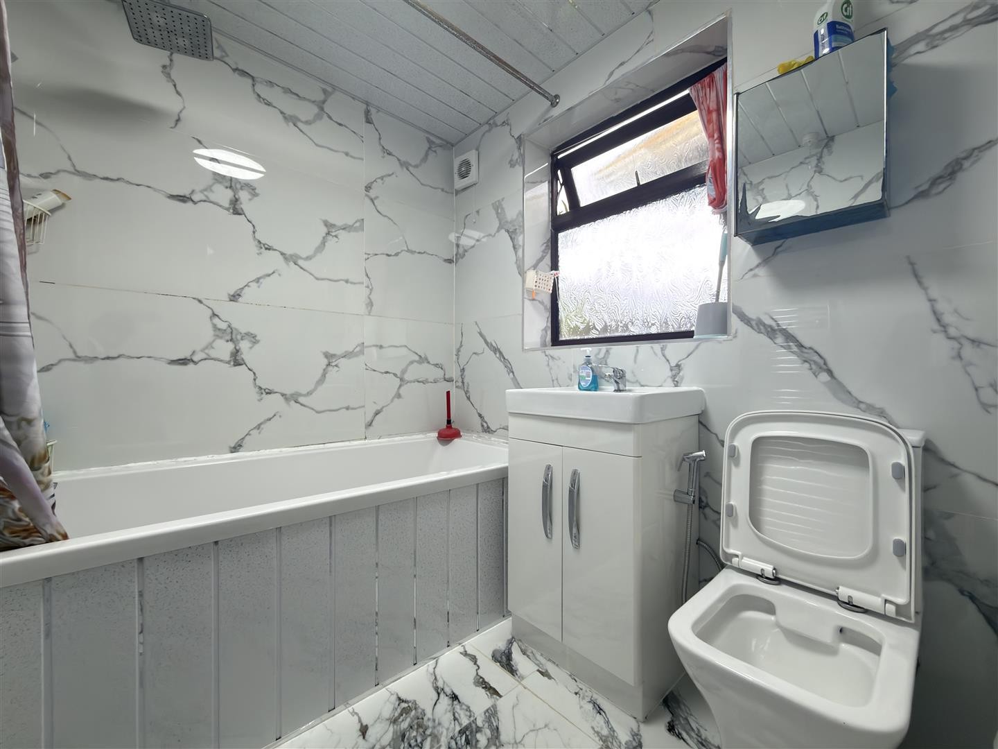 Finished with tiled flooring, tiled walls, and a panelled ceiling. Comprising a standing radiator, toilet, wash hand basin with vanity unit, and a polyvinyl bathtub with mixer function and rainfall shower attachment. A double-glazed window faces the side aspect.