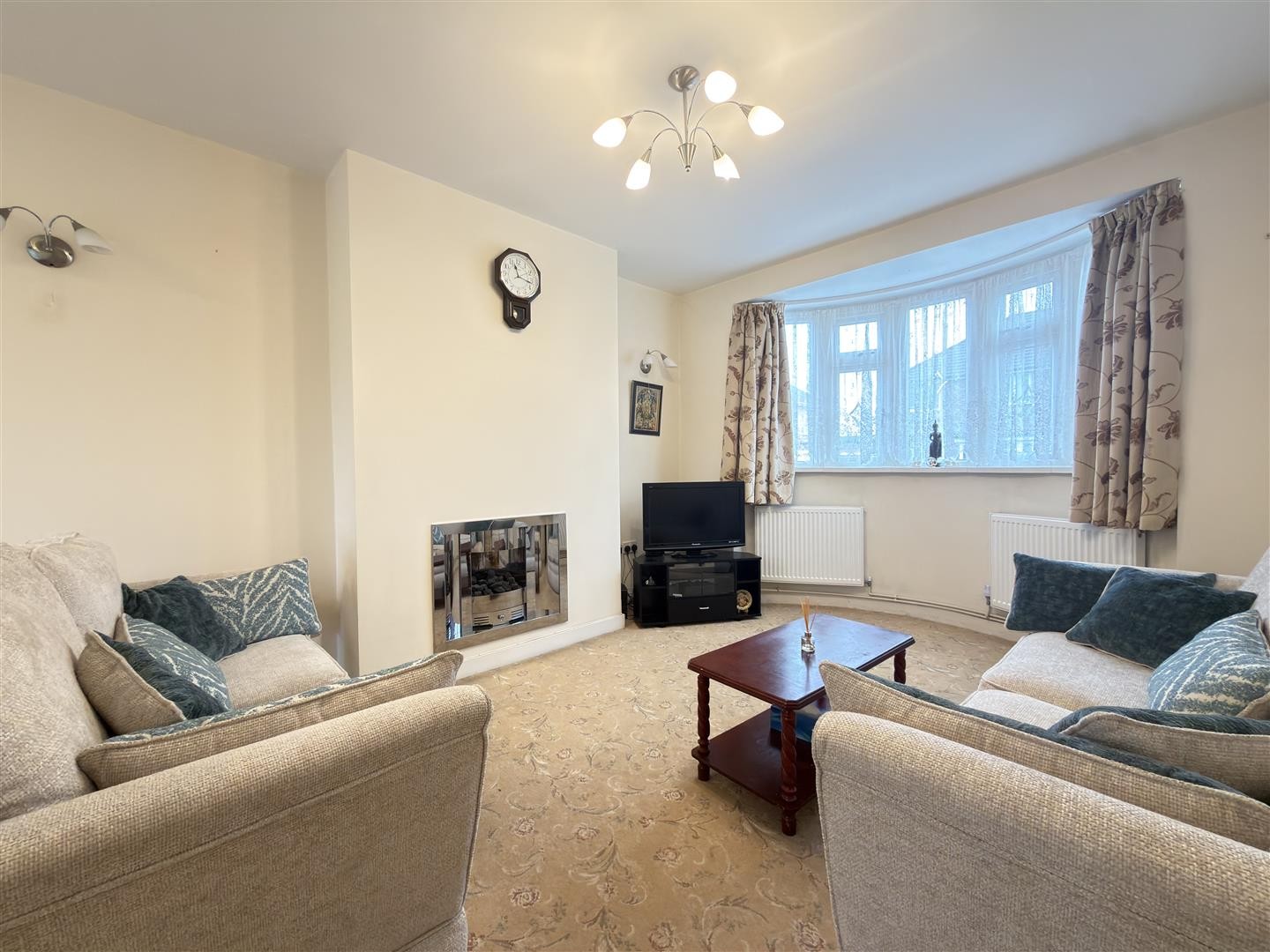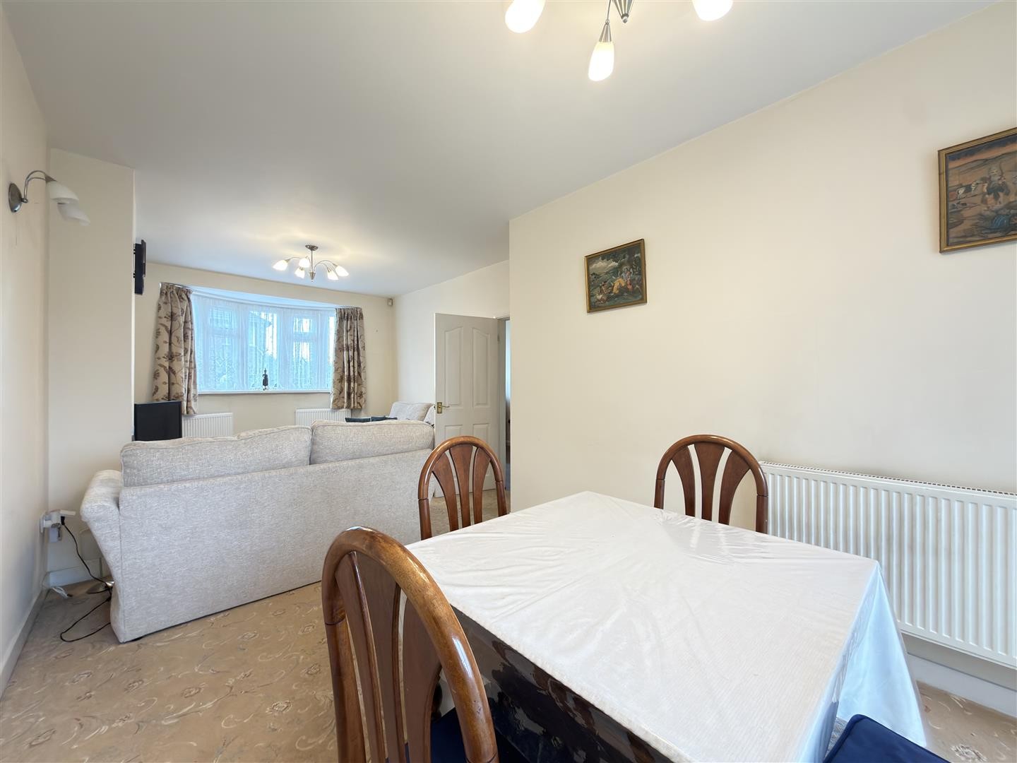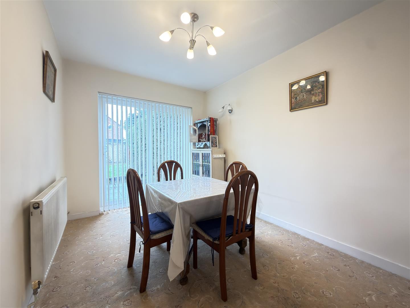 A through lounge featuring carpeted flooring and radiators, with a double-glazed bay window facing the front aspect. The room includes a feature fireplace and a dedicated dining area with an additional radiator. Sliding double-glazed UPVC doors provide access into the garden.