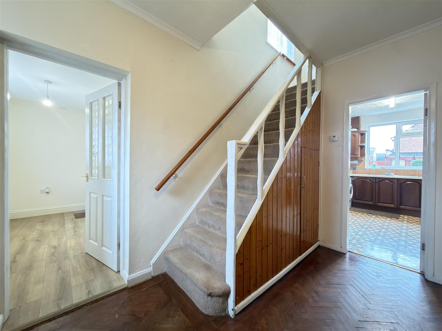 Finished with herringbone-style wooden flooring and a radiator, with stairs rising to the first floor. A storage cupboard is located under the staircase. The hall provides access to the kitchen, lounge/diner, and the extended reception room to the side.