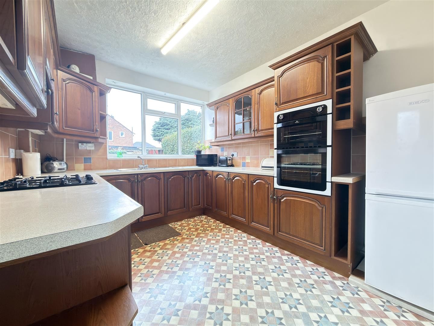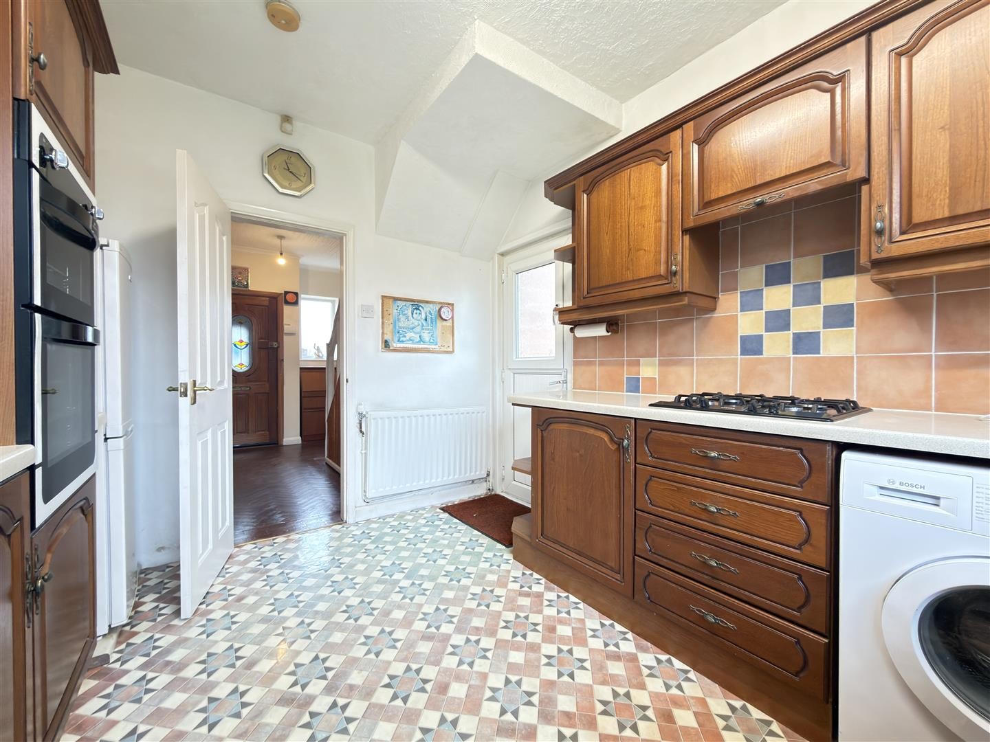 Finished with vinyl flooring and partially tiled walls, fitted with base and eye-level units. Features an integrated gas burner with extractor over, integrated oven and grill, stainless steel sink, space and plumbing for a washing machine, and space for a fridge. The gas-powered boiler is installed here. A large double-glazed window faces the rear aspect, and a UPVC door provides access into the garden.