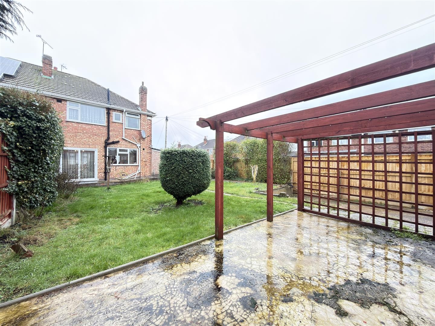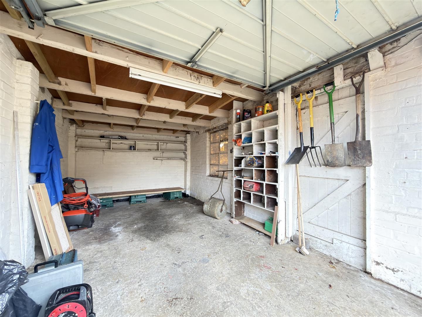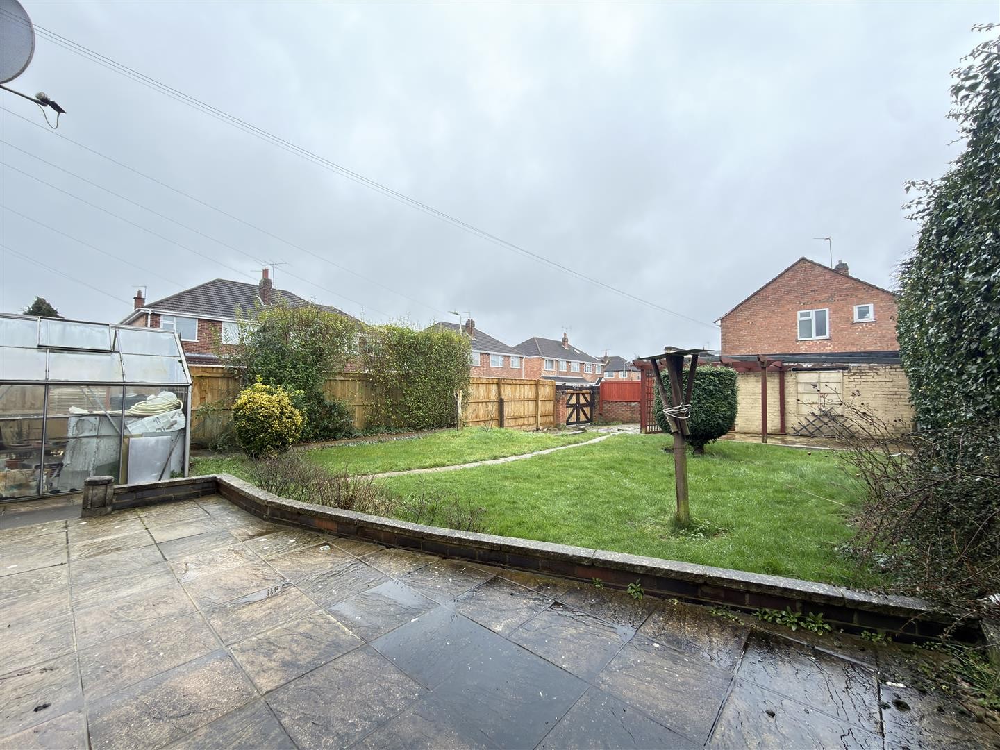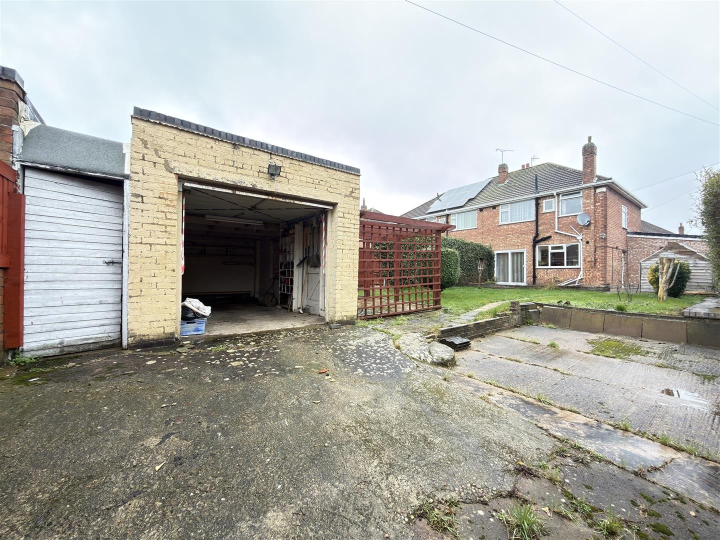 To the rear, the property benefits from an ample-sized garden, enhanced by its corner plot position. There is a slabbed patio area leading onto a grass lawn, with a further concrete section providing vehicular access via a side gate and access into a large garage through an up-and-over door. A wooden shed is also situated within the garden. The space is secluded by a combination of hedges and wooden fencing along the perimeter.