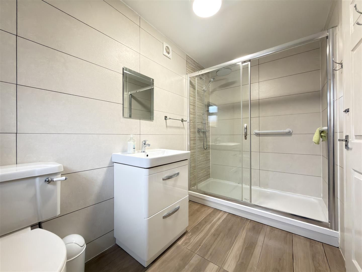 Comprising tiled flooring and tiled walls, with a large stand-up shower cubicle featuring a mixer function and rainfall shower attachment. Also includes a wash hand basin with vanity unit, toilet, standing radiator, and a double-glazed window facing the side aspect.
