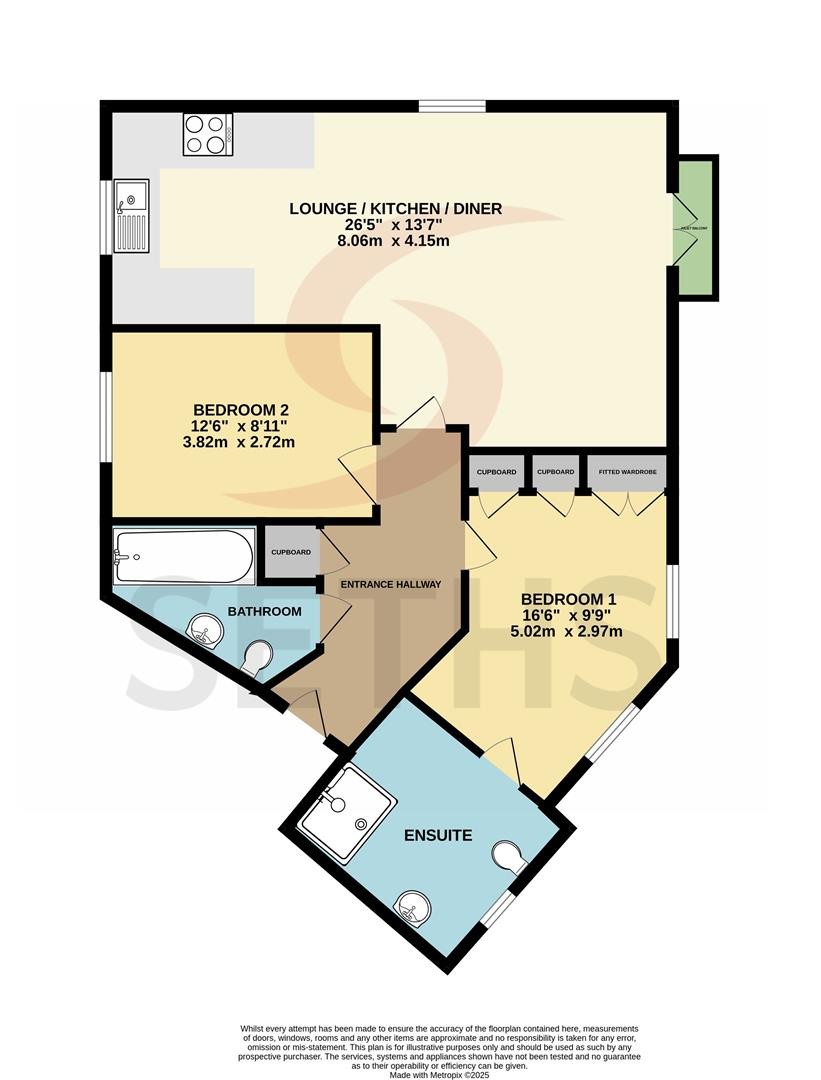 Wall and base units with worktops over, 4 ring electric hob with built-in oven and extractor hood, sink with mixer tap and drainer, space for fridge / freezer, partly carpeted, partly lino flooring, electric radiator, Juliet balcony, x2 uPVC double glazed windows