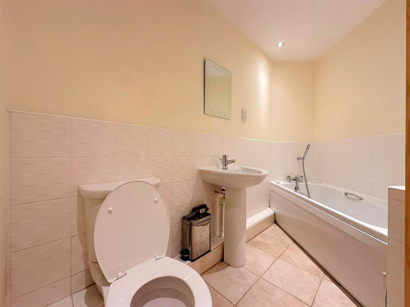 WC, wash hand basin with mixer tap, bathtub with mixer tap and shower overhead, tiled flooring, tiled walls, extractor fan