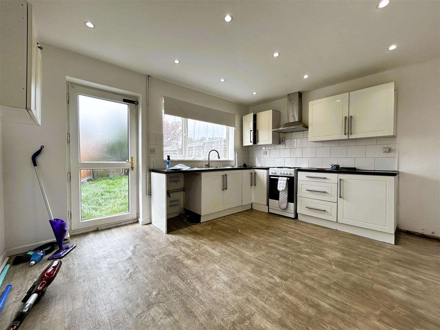 Vinyl flooring, dining area, radiator, consumer unit, base and high-level units, stainless steel sink, integrated extractor over, space for boiler, space and plumbing for washing machine, space for fridge, partially tiled walls, spotlighting, double-glazed window to the side aspect. uPVC door providing access to the rear garden.