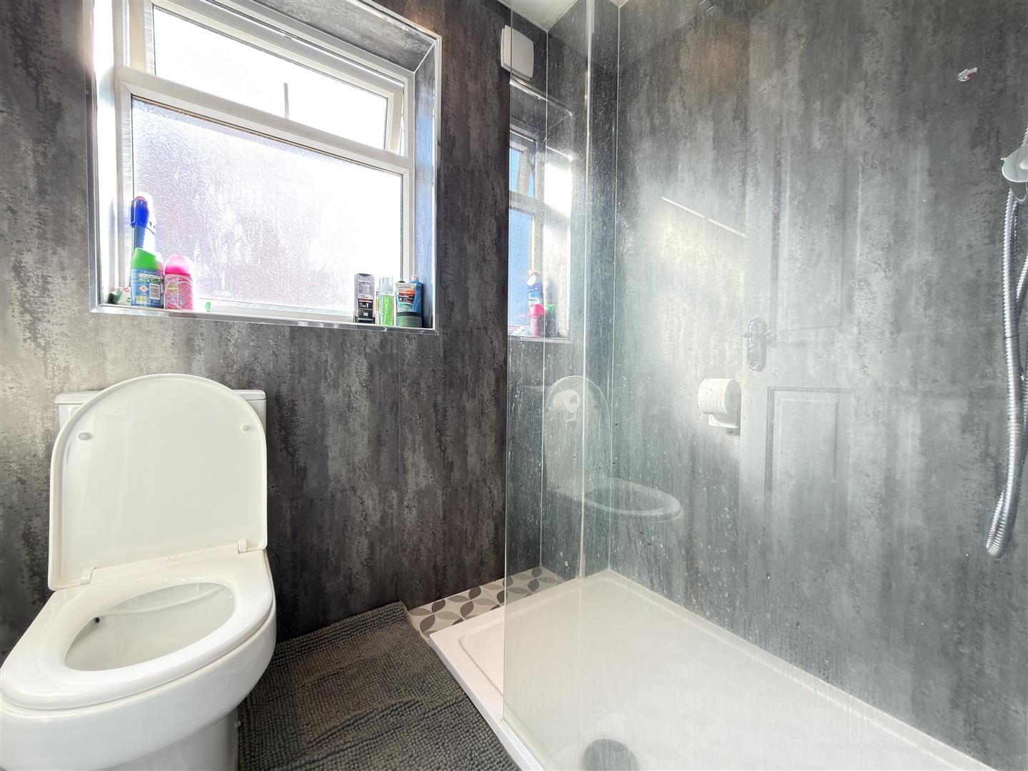 Vinyl flooring, panelled walls, spotlighting, double-glazed window to the side aspect, shower with mixer function, WC.