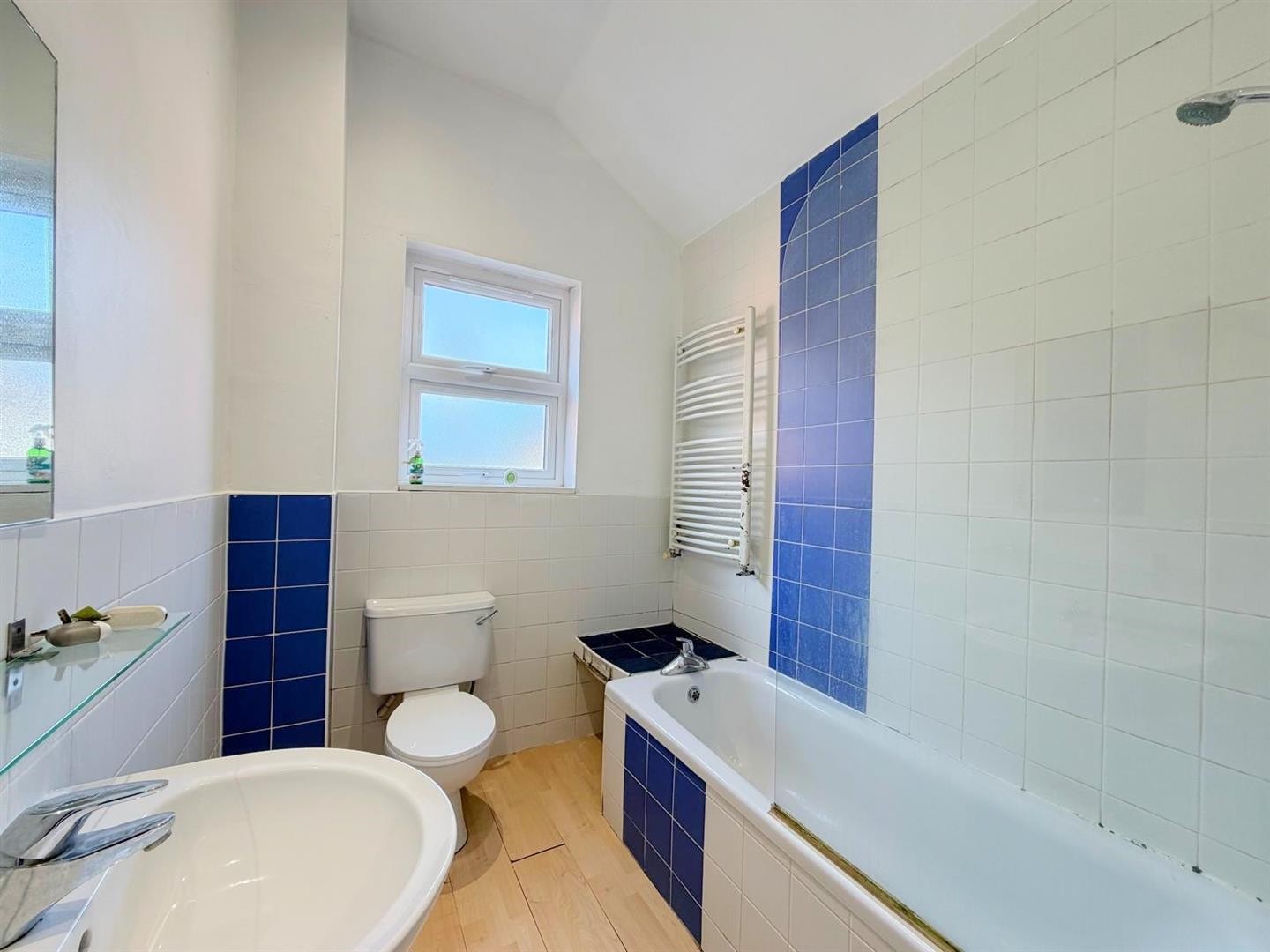 WC, wash hand basin with mixer tap, bathtub with mixer tap and shower over, laminate flooring, partly tiled walls, towel radiator, airing cupboard, uPVC double glazed window