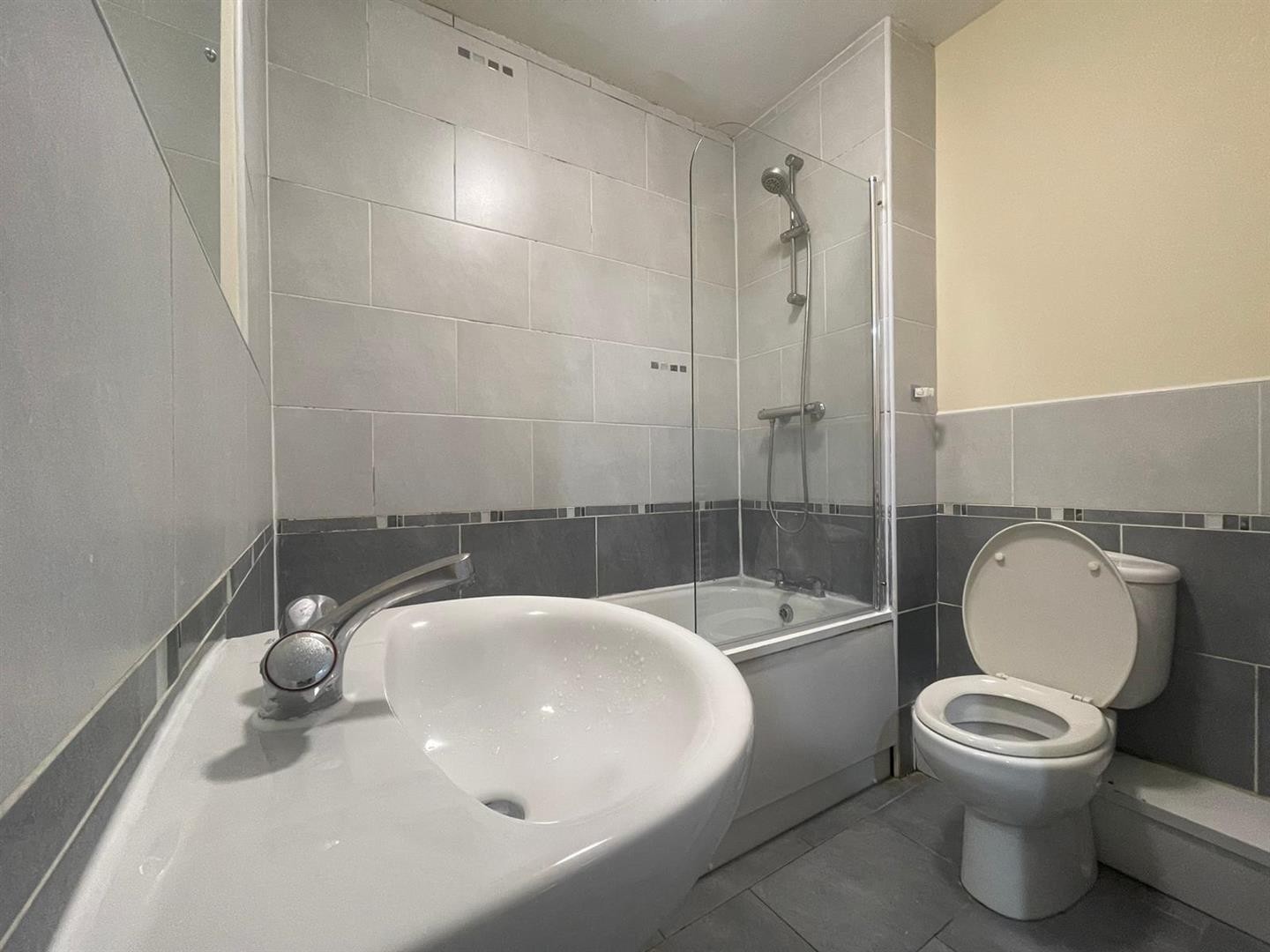 3 pc suite comprising of WC, wash hand basin with mixer tap, bathtub with shower overhead, tiled flooring, partly tiled walls
