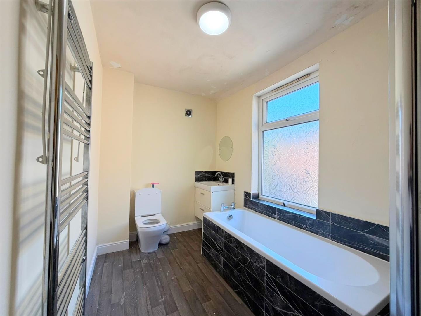 4 pc suite comprising of; WC, wash hand basin with mixer tap and vanity units, bathtub with mixer tap, shower cubicle, lino flooring, partly tiled walls, towel radiator, extractor fan, uPVC double glazed window