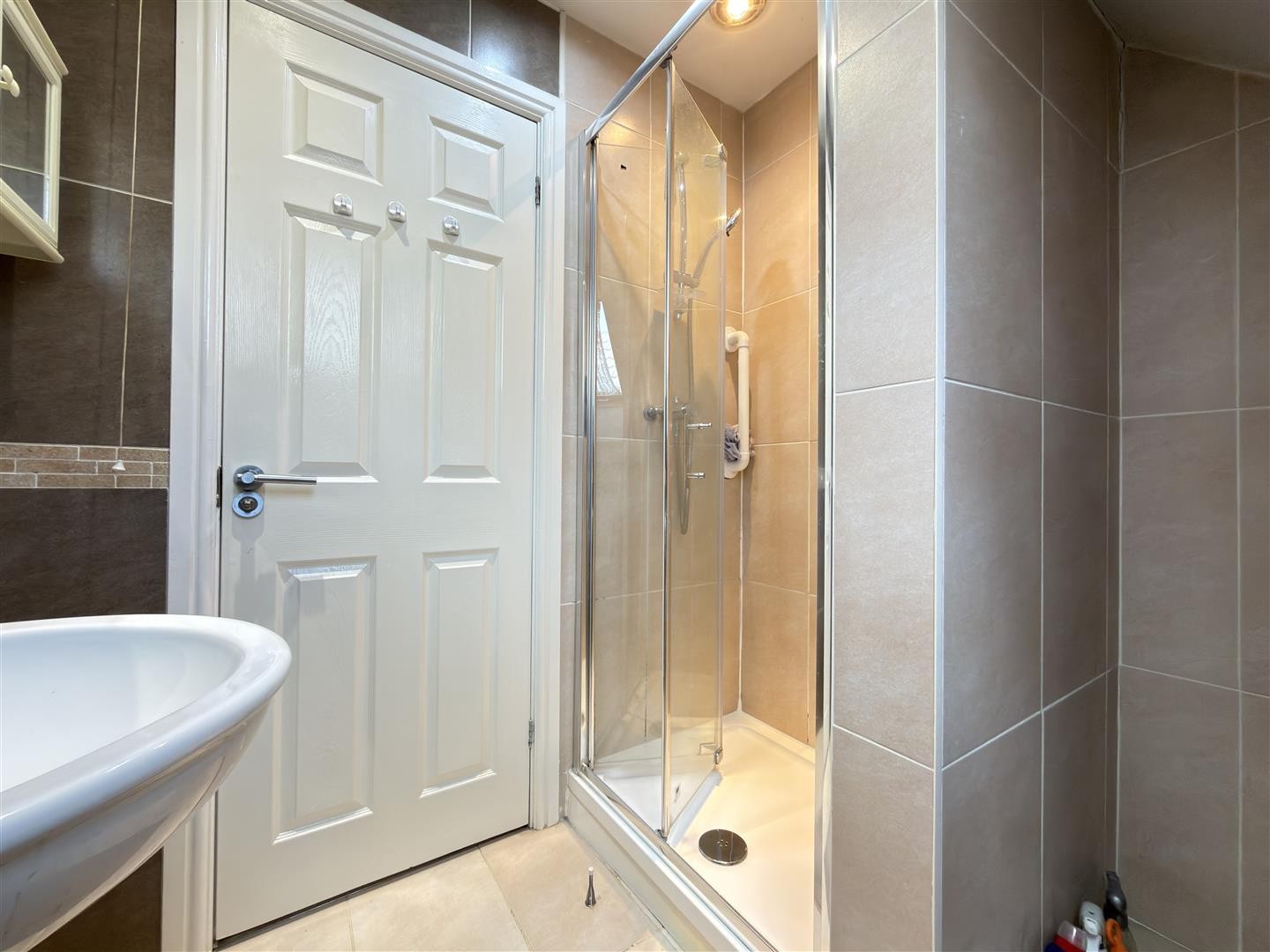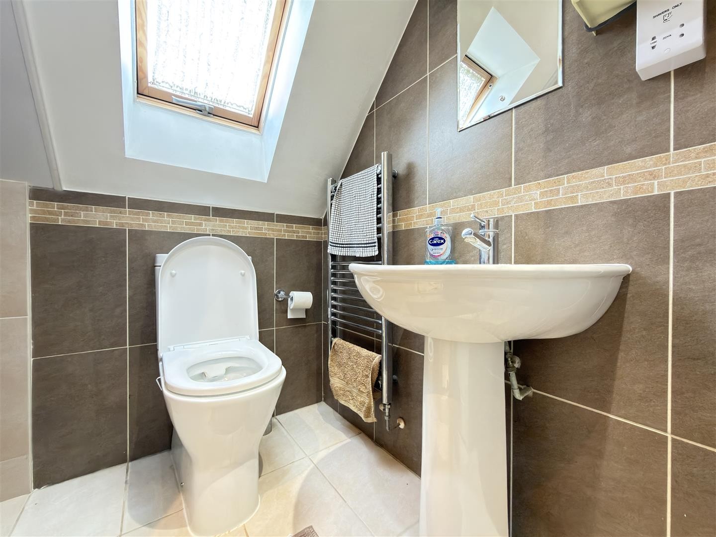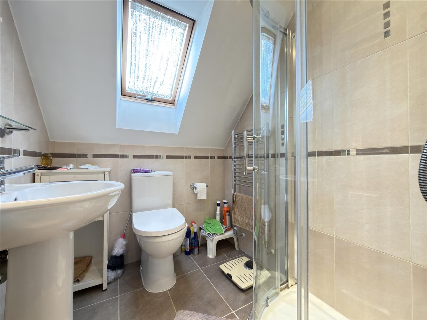 Tiled flooring, tiled walls, spotlighting, standing towel rail radiator, shower cubicle with mixer function, wash hand basin, WC, Velux window to the side aspect.