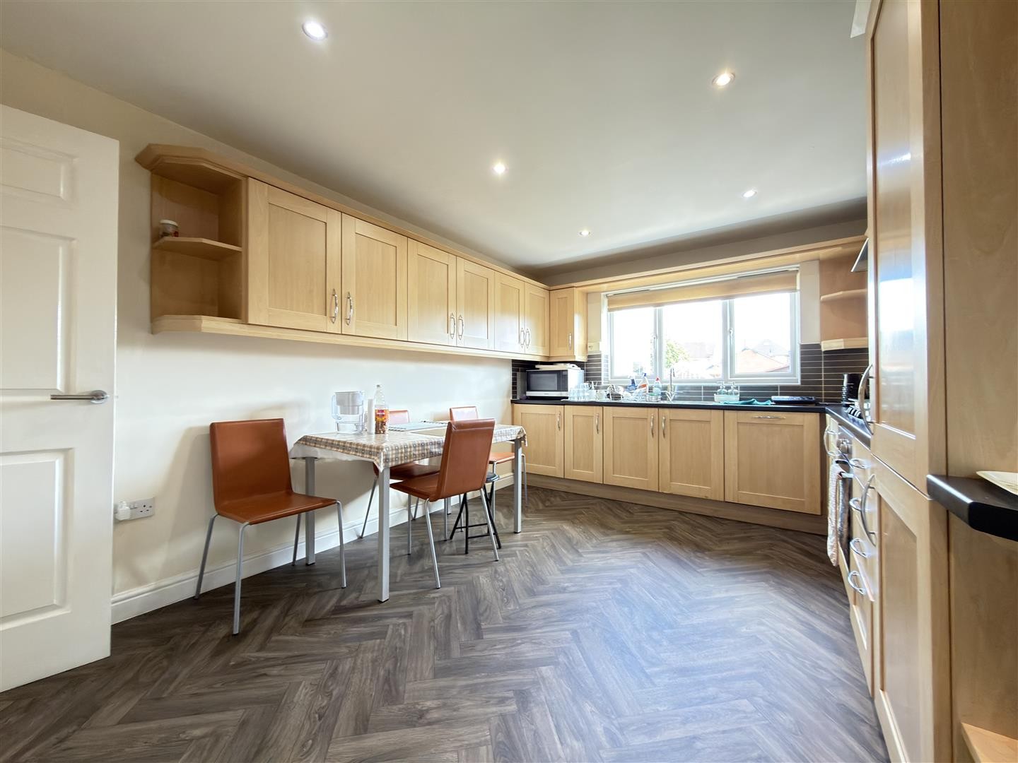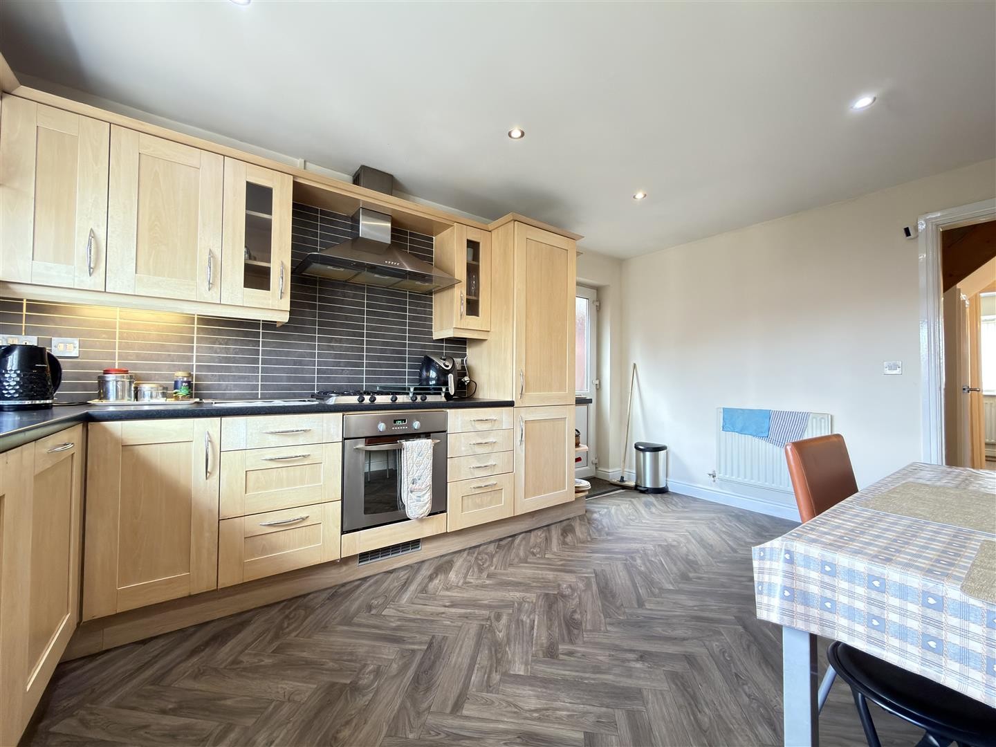 Laminate flooring, radiator, base and eye-level units, four-ring gas hob with oven and integrated extractor over, stainless steel sink, ample space for a four-seater dining table, partially tiled walls, accent lighting, spotlighting, double-glazed window to the rear aspect. uPVC door providing access to the rear garden.