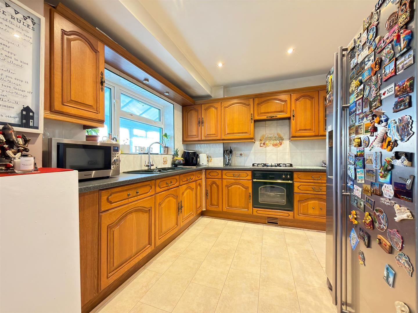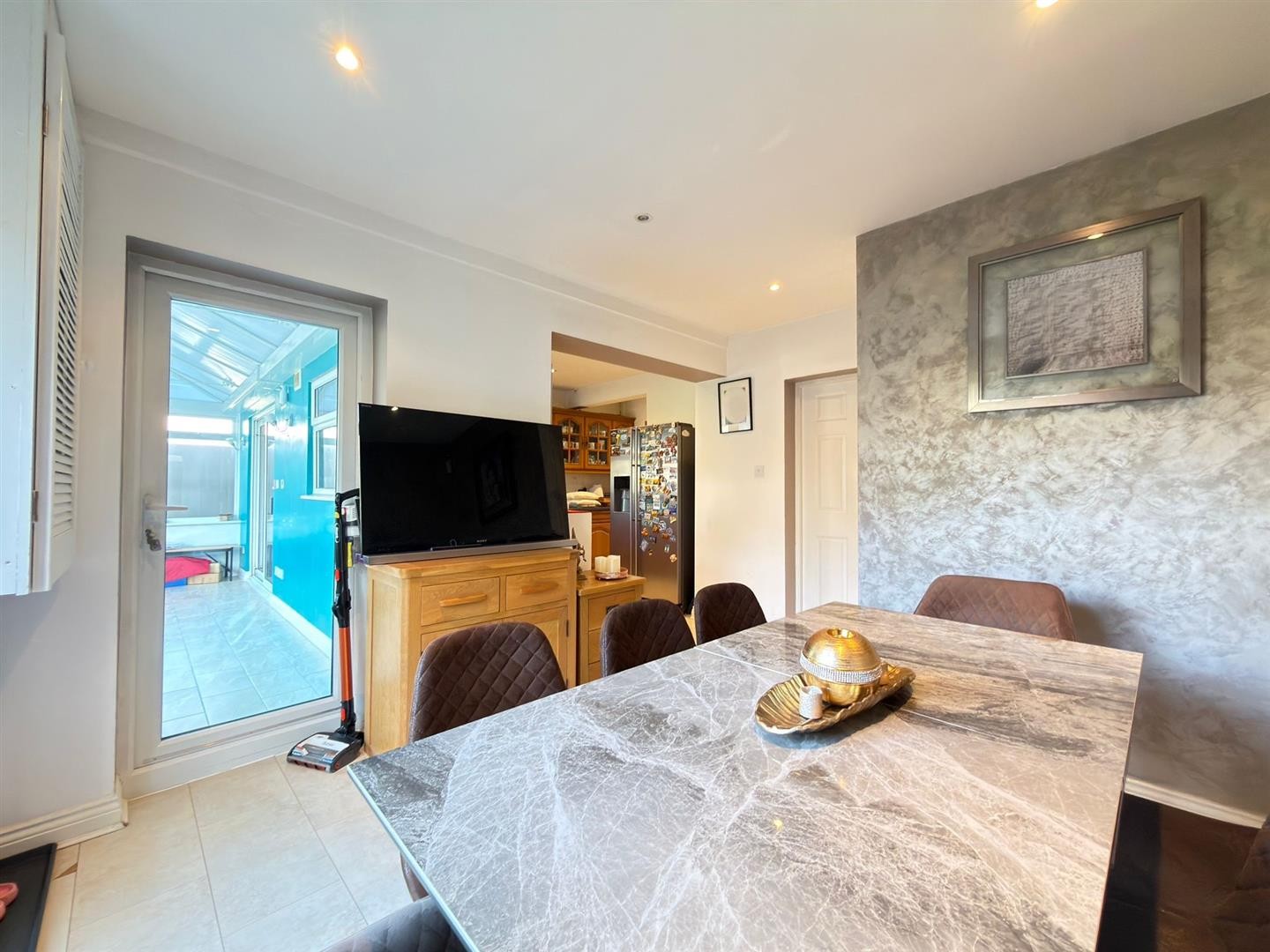 Fitted wall and base units with worktops over, 5 ring gas hob with built-in oven and extractor hood, sink with mixer tap , plumbing for dishwasher, space for American fridge/freezer, space for dining table, radiator, tiled flooring, partly tiled walls, radiator, uPVC double glazed window, uPVC double glazed French doors leading to rear garden, uPVC double glazed door leading to conservatory