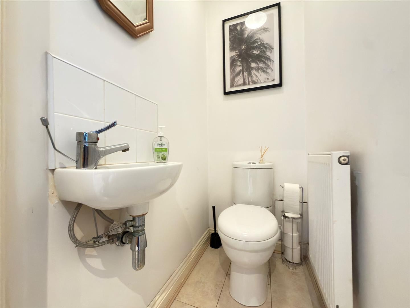 WC, wash hand basin with mixer tap and splashback tiles, radiator, tiled flooring.