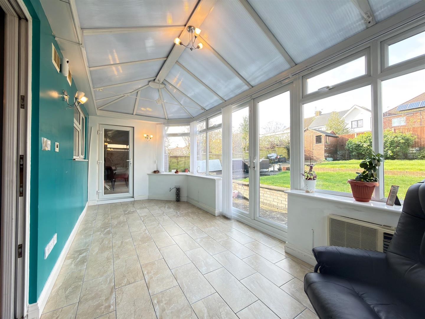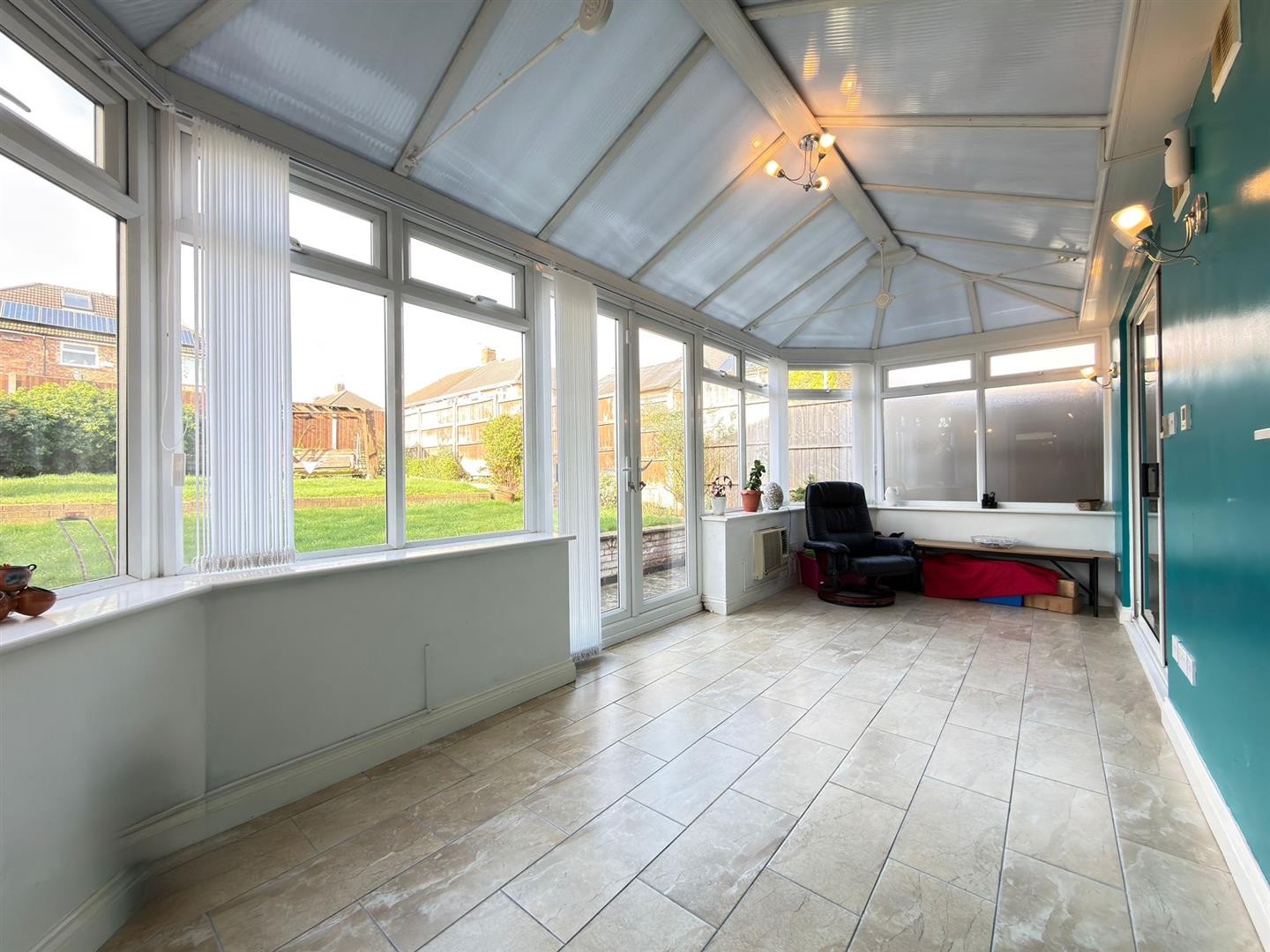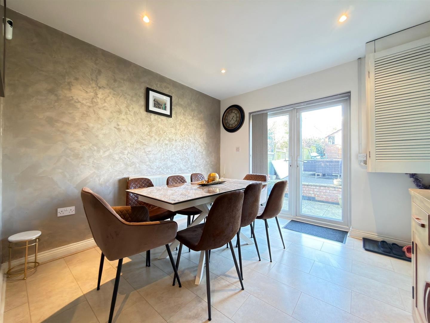 Tiled flooring, AC unit, uPVC double glazed French doors leading to rear garden