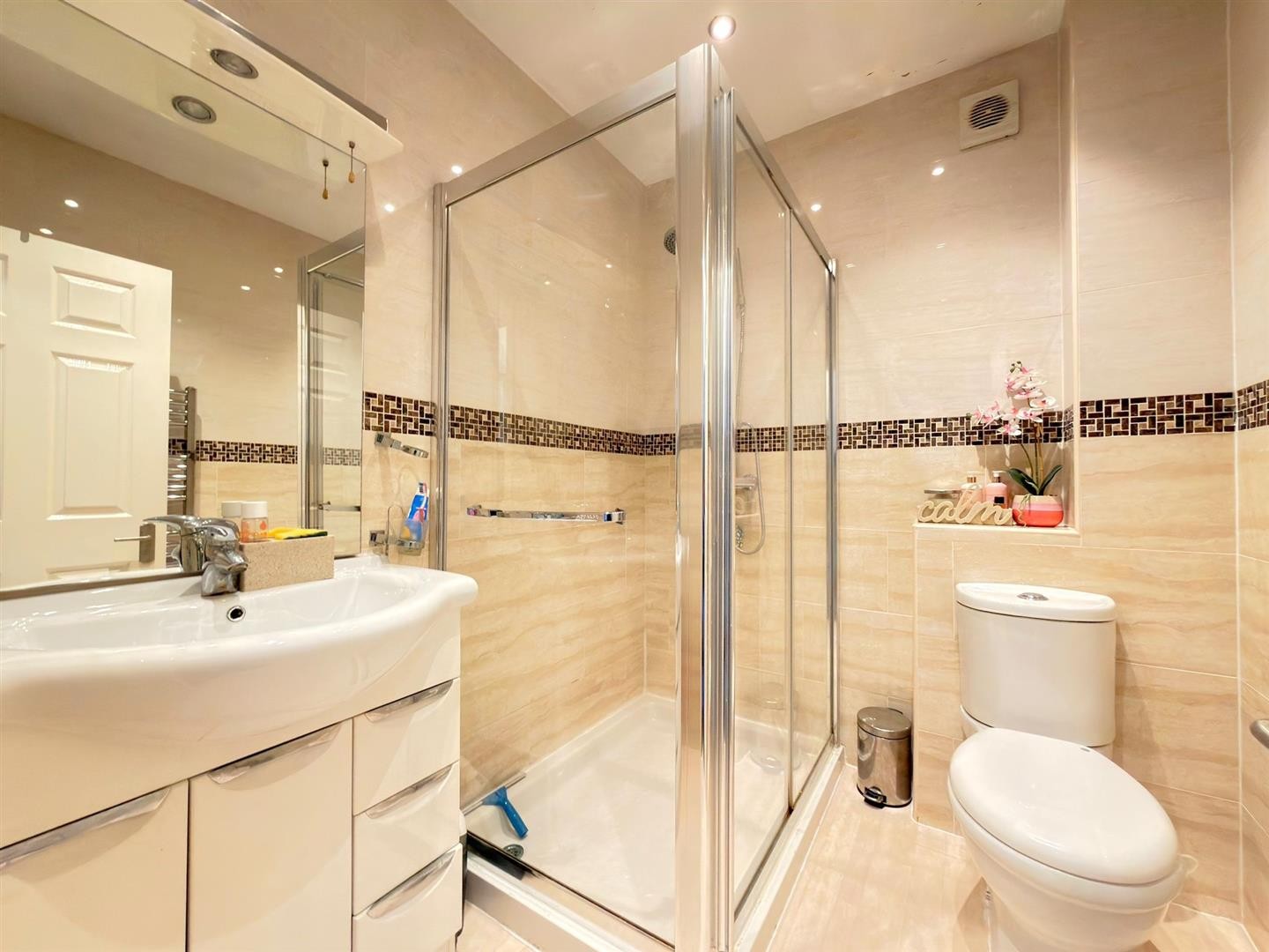WC, wash hand basin with mixer tap and vanity units, shower cubicle, radiator, vinyl flooring, tiled walls, extractor fan