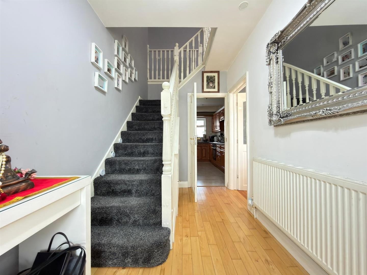 Laminate flooring, radiator, understairs storage cupboard, staircase leading to first floor