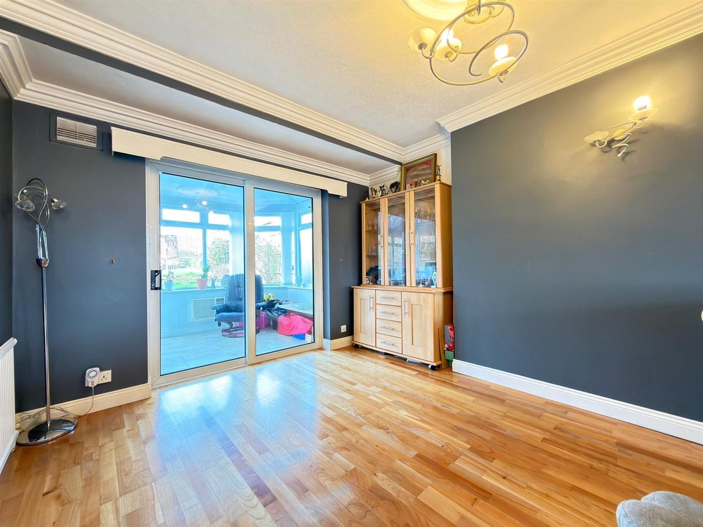 Laminate flooring, x2 radiators, fireplace, uPVC double glazed bay window, sliding doors leading to conservatory