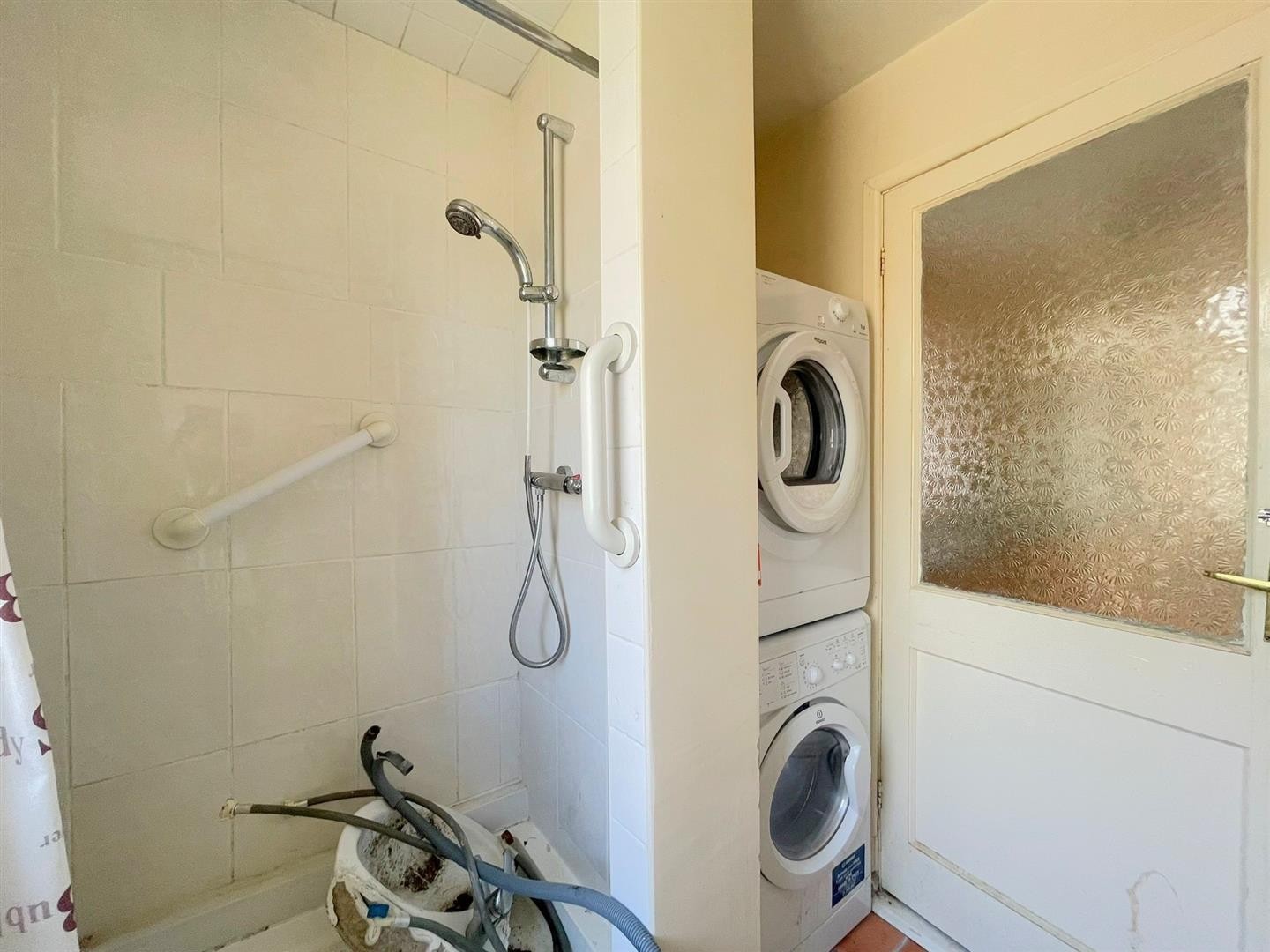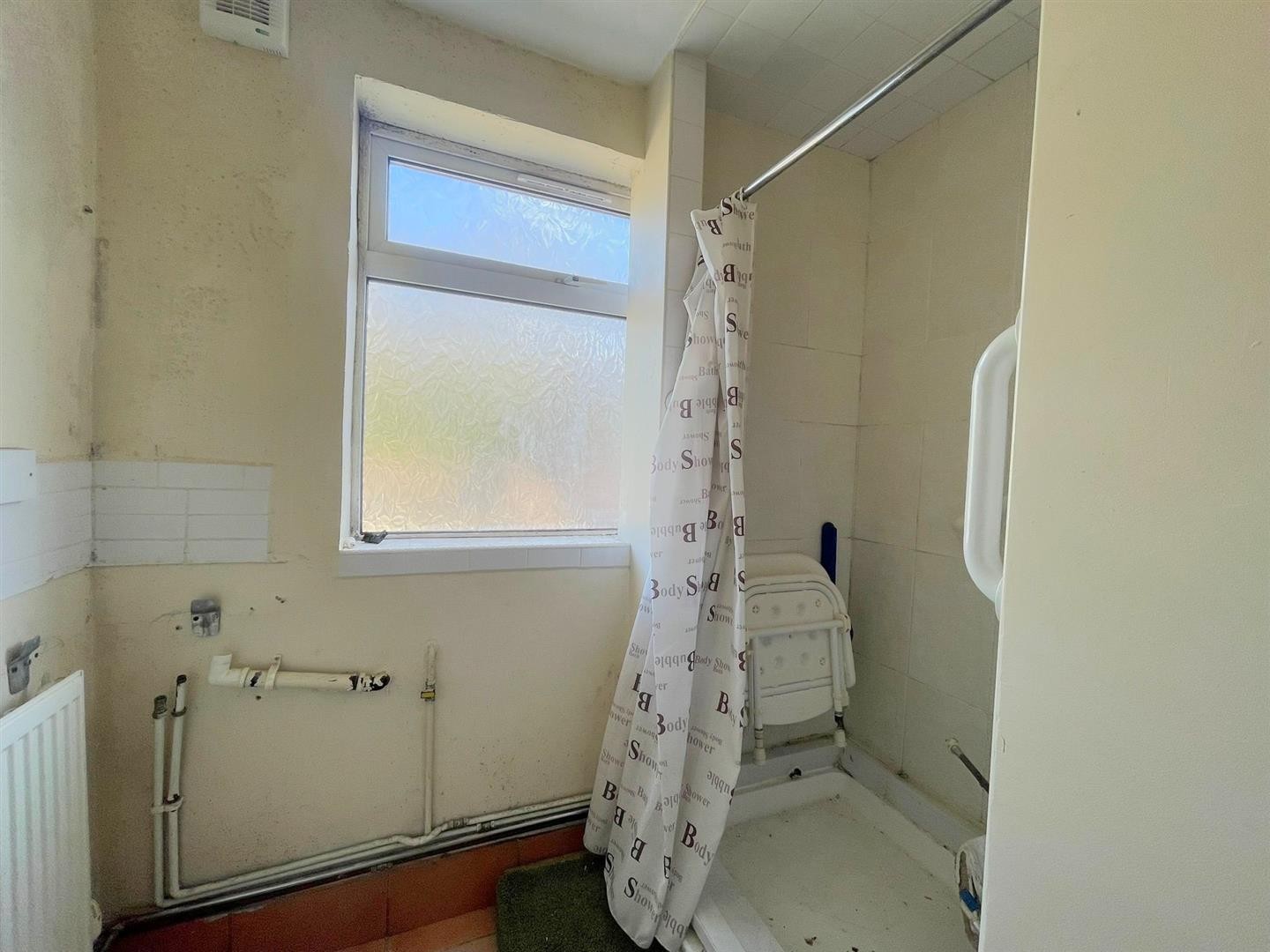 Walk in shower with shower overhead, plumbing for washing machine, tiled flooring, partly tiled walls, radiator, uPVC double glazed window