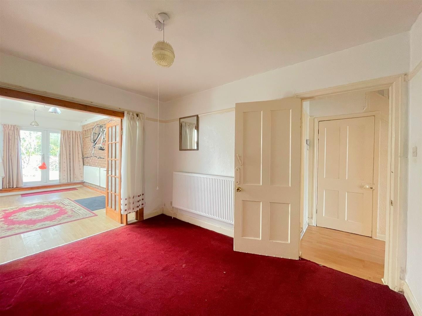 Carpeted, radiator, double doors leading to dining room