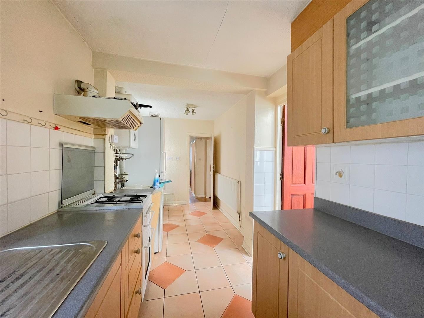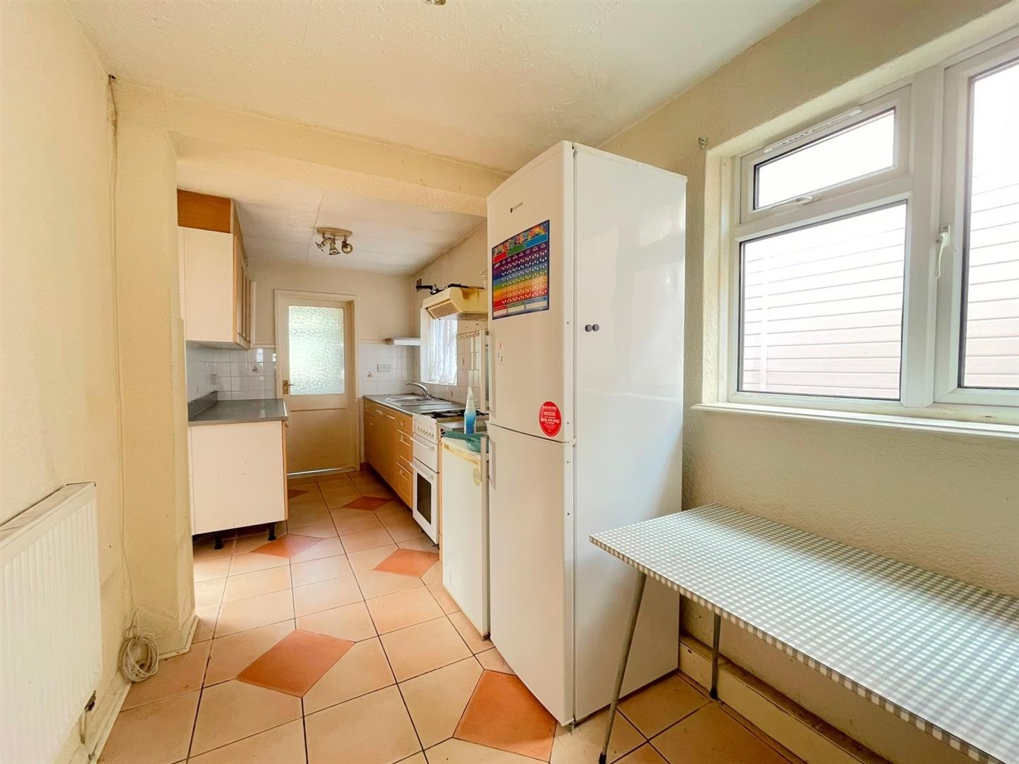 Wall and base units with worktops over, space for cooker with extractor hood, sink with mixer tap and drainer, space for fridge/freezer, space for breakfast table, radiator, tiled flooring, partly tiled walls, x2 uPVC double glazed windows
