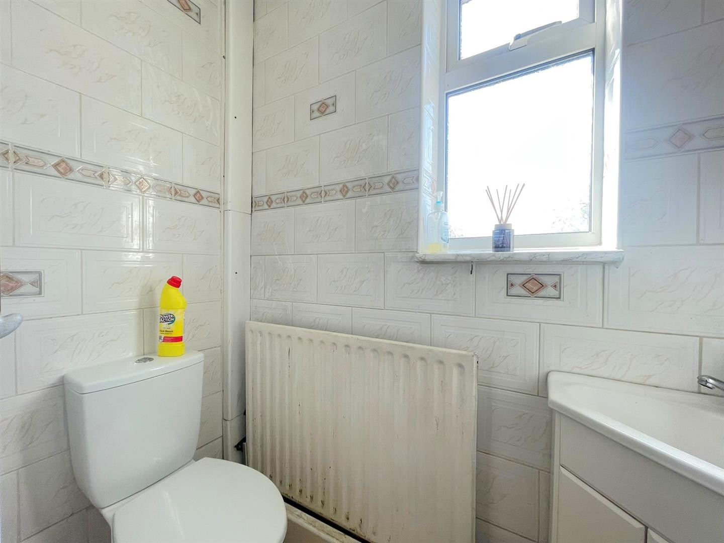 WC, wash hand basin with mixer tap and vanity units, radiator, tiled flooring, tiled walls, uPVC double glazed window