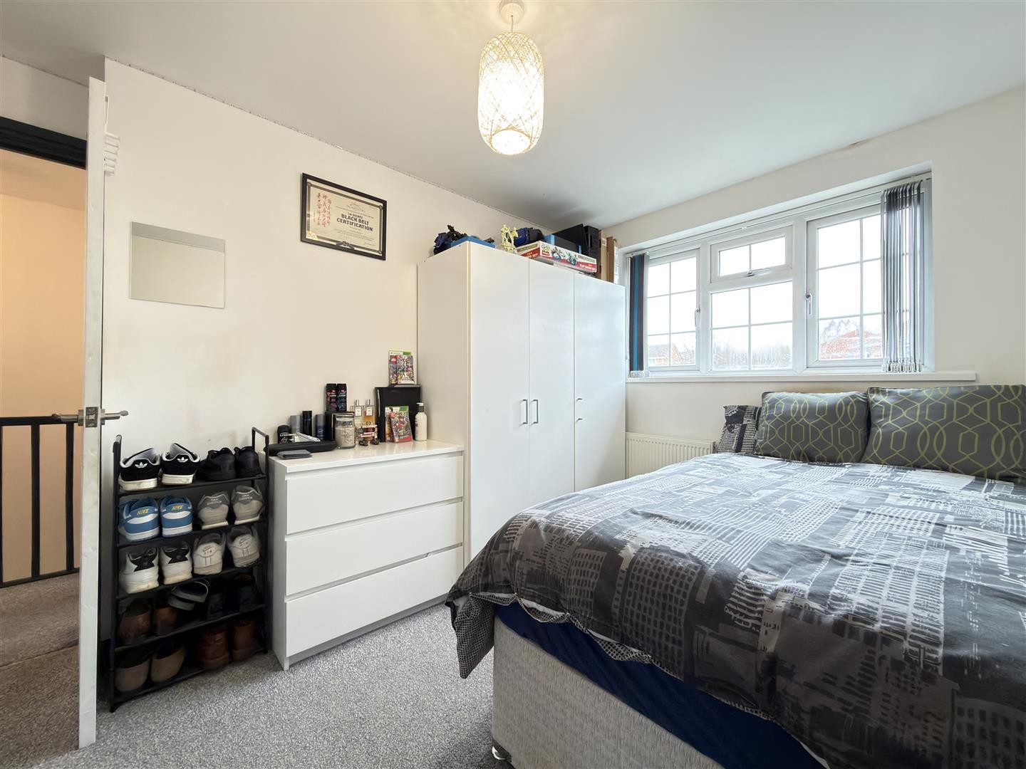 Carpeted and bright, with a side-facing double-glazed window and loft access. Provides access to all first-floor rooms.