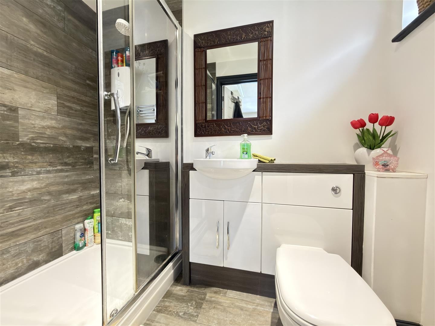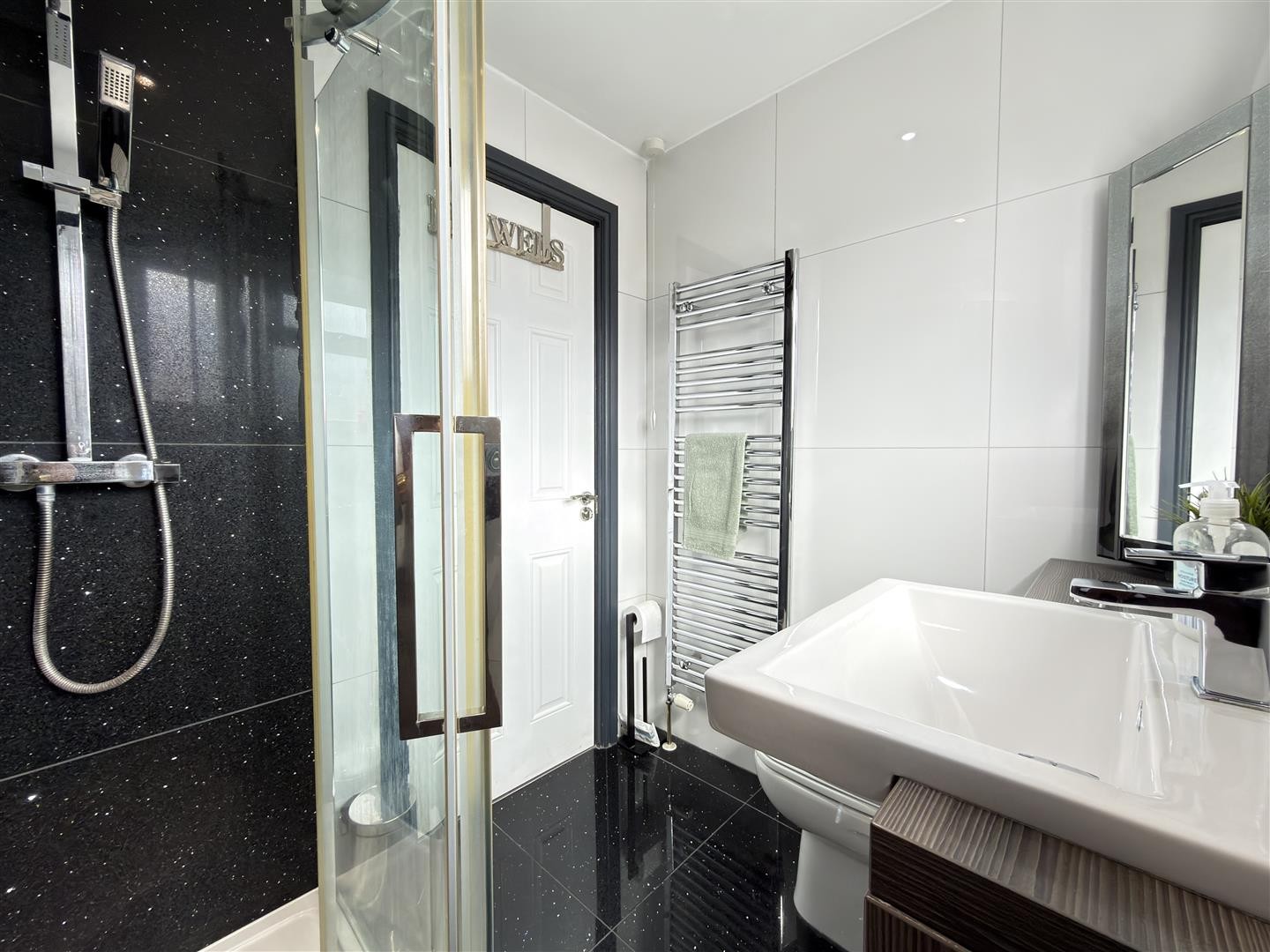 Finished to an excellent standard with quartz tiled flooring and porcelain tiled walls. Comprising a vanity unit with wash hand basin, WC, heated towel radiator, and a contemporary shower enclosure with mixer valve and overhead rainfall attachment.