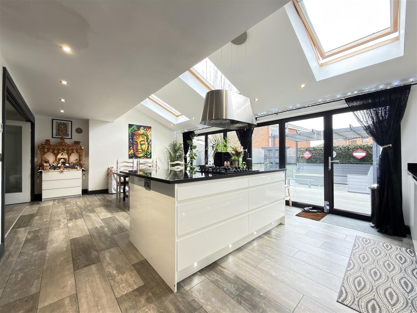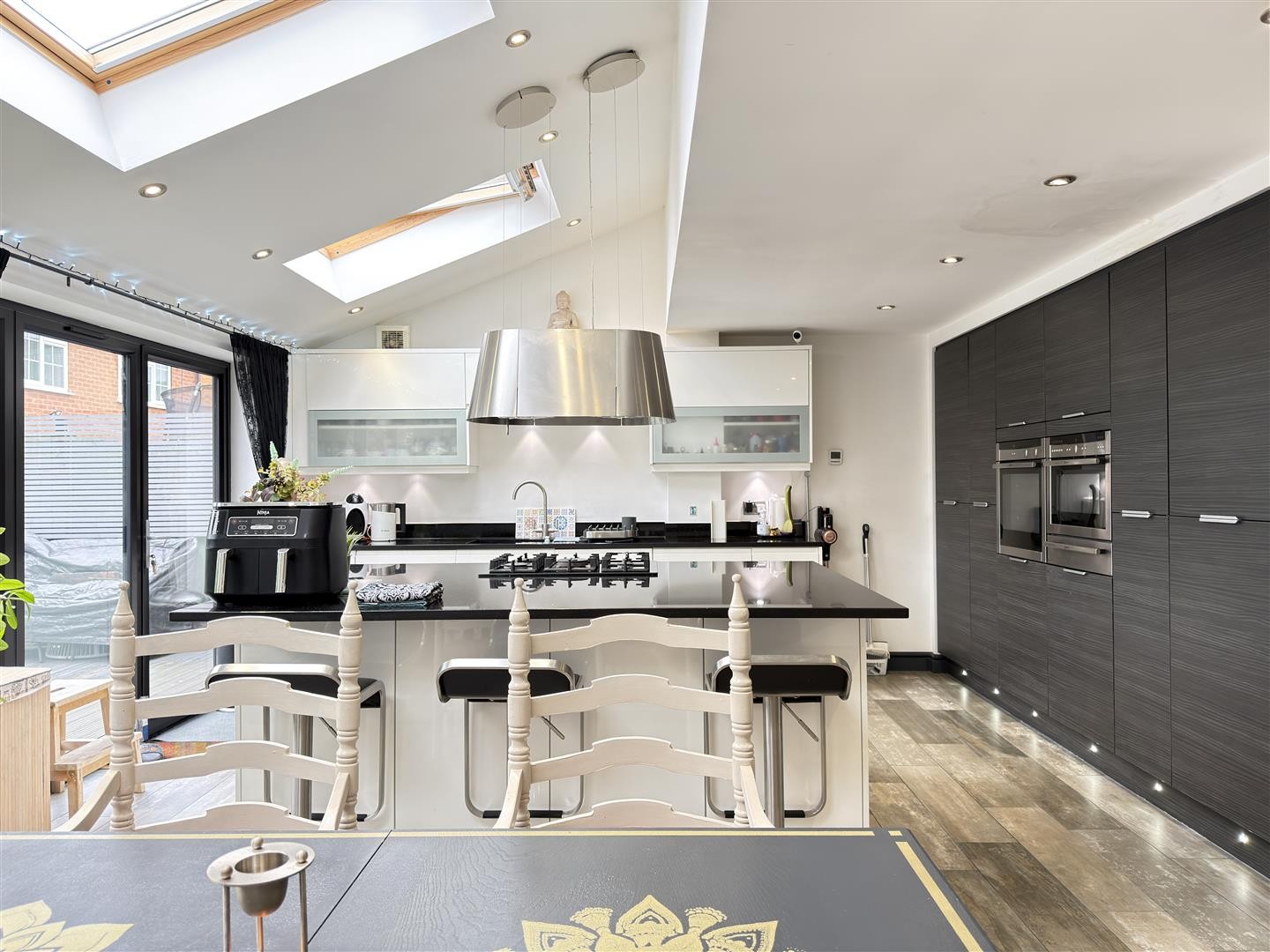6-panel bifold doors open fully onto the south-facing garden, creating a superb indoor-outdoor flow. Three Velux windows further enhance the natural light.