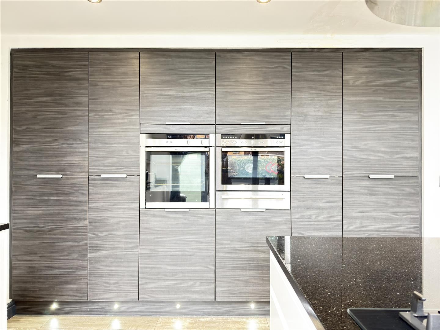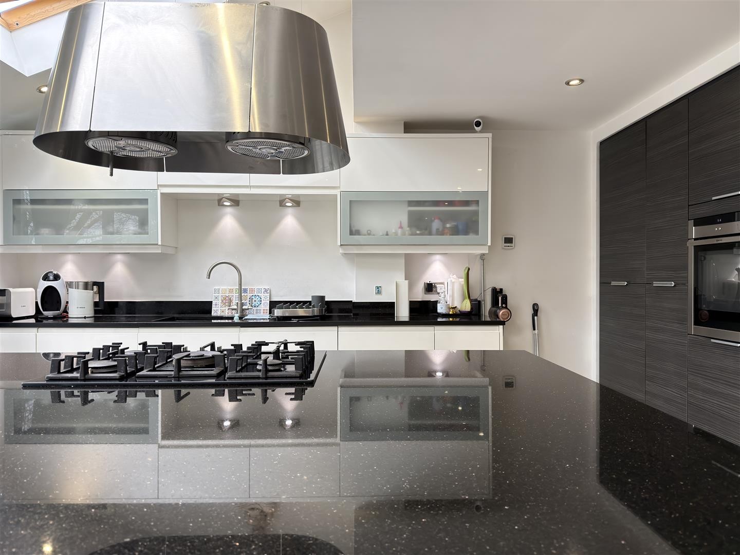The kitchen is fitted with granite worktops and high-quality cabinetry, complemented by integrated NEFF and CDA appliances, including oven, grill, microwave, warming drawer, dishwasher, washer/dryer, and two integrated fridge freezers. A recessed composite sink and an Elica extractor sit above the integrated gas hob within a granite-topped island.