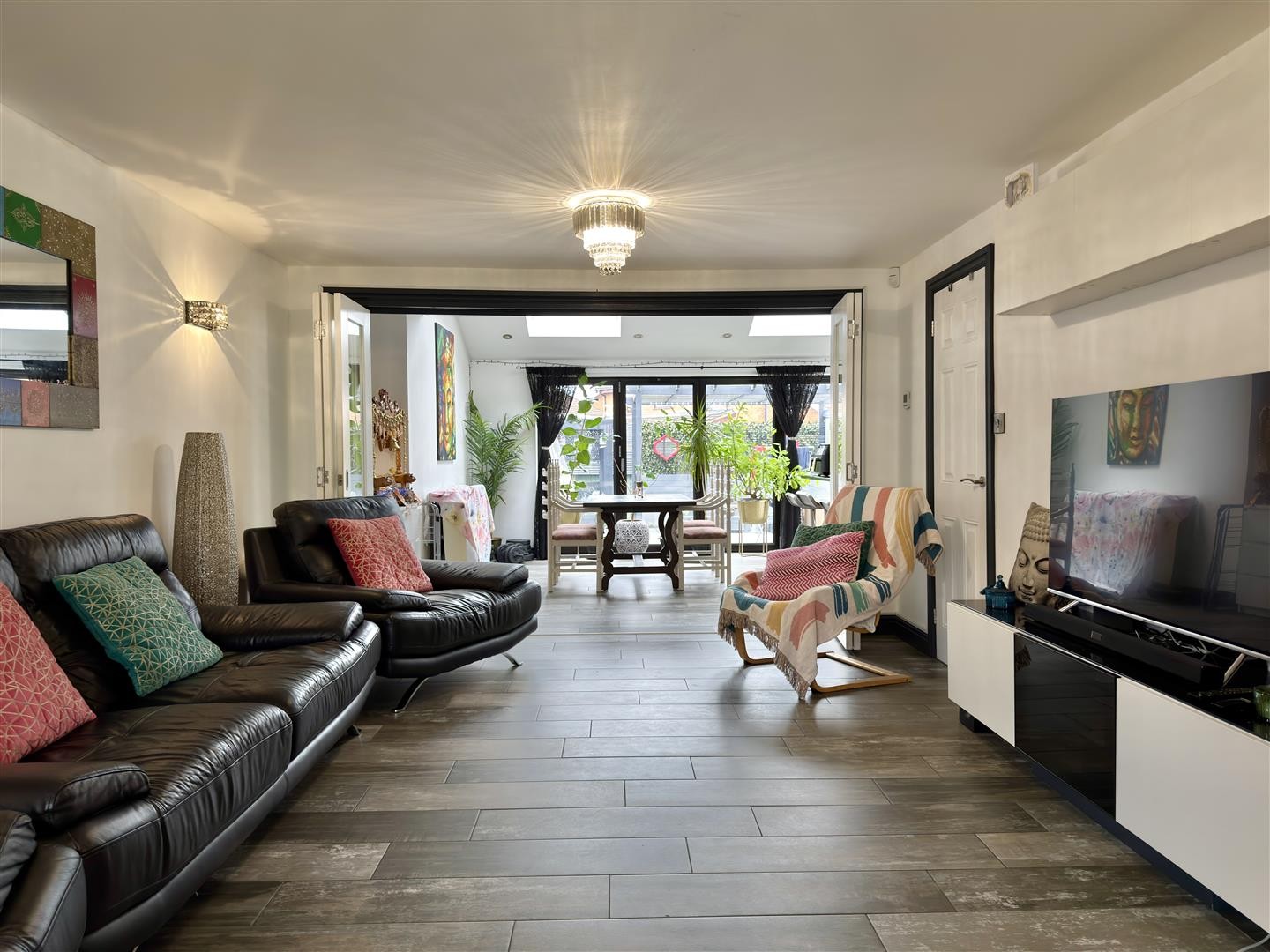 Striking internal 5-panel bifold doors open seamlessly into the extended kitchen and dining area, allowing the space to be opened for entertaining or closed for a more intimate setting.