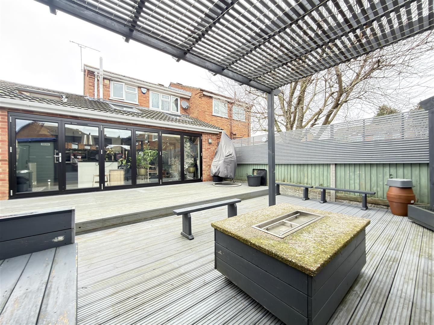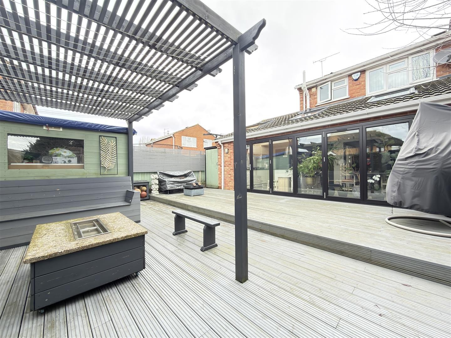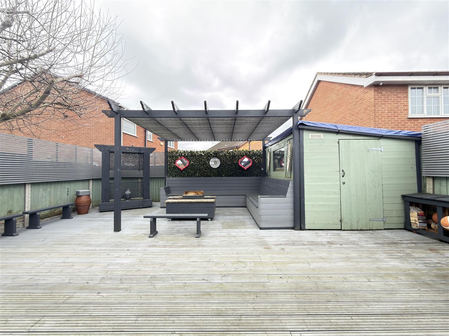A well-designed outdoor space featuring a decked patio area, ideal for entertaining, enclosed by a wooden fenced perimeter. The garden also benefits from a wooden-built shed, also an additional smaller shed integrated seating area with pergola, and external electric points.