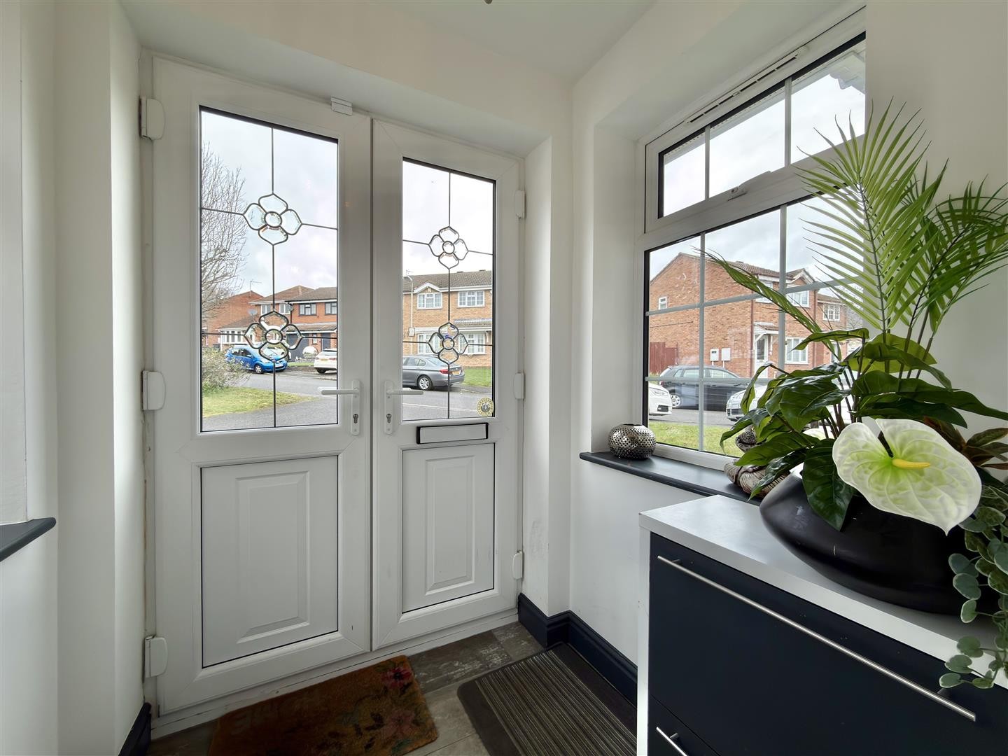 A welcoming entrance finished with porcelain tiled flooring, accessed via UPVC double-glazed doors. Double-glazed side windows provide natural light, and a UPVC door leads into the main hallway.
