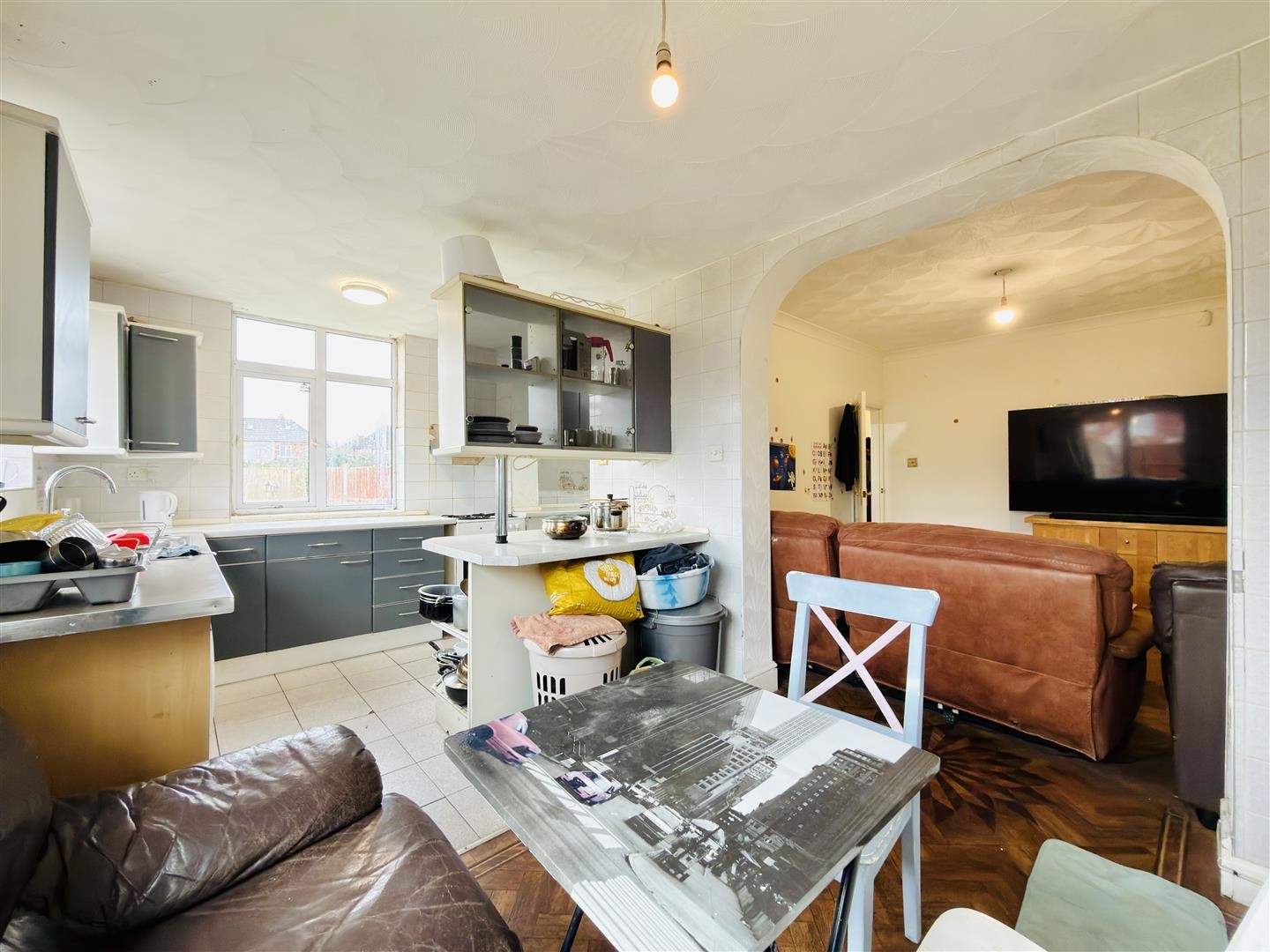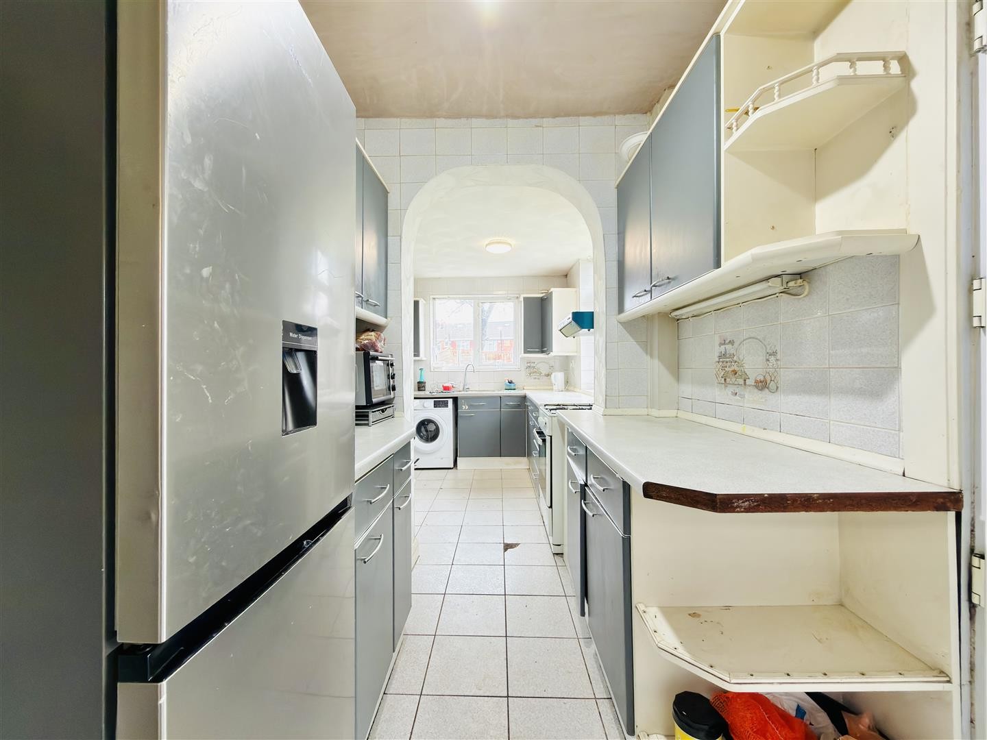 Finished with tiled flooring and tiled walls, offering base and eye-level units, space for a fridge, space for a gas cooker with oven and integrated extractor over, stainless steel sink, and space and plumbing for a washing machine. Double-glazed windows face the side and rear aspects, and sliding double-glazed doors provide access into the garden. A UPVC door also allows additional garden access, with a radiator located within the dining area.