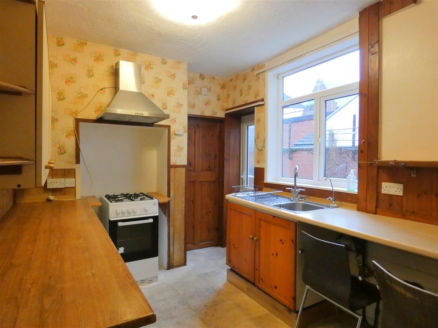 Wall and base units with worktops over, space for 4 ring gas hob and oven, extractor hood, sink with mixer tap and drainer, plumbing for washing machine, space for fridge / freezer, lino flooring, uPVC double glazed door leading to garden, uPVC double glazed window