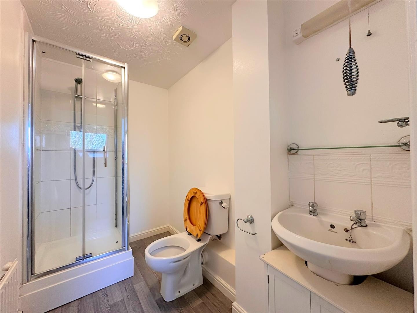 WC, wash hand basin with vanity units, shower cubicle, lino flooring, partly tiled walls, radiator, extractor fan
