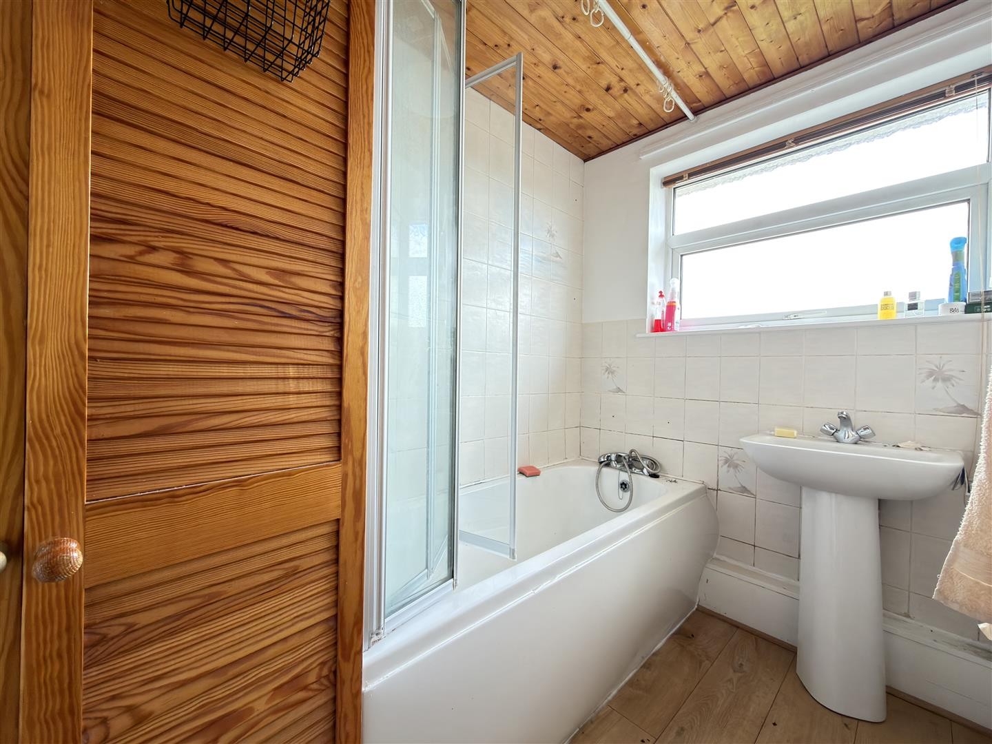 Vinyl flooring, partially tiled walls, storage cupboard, panelled bath with electric shower over, wash hand basin, double-glazed window to the front aspect.