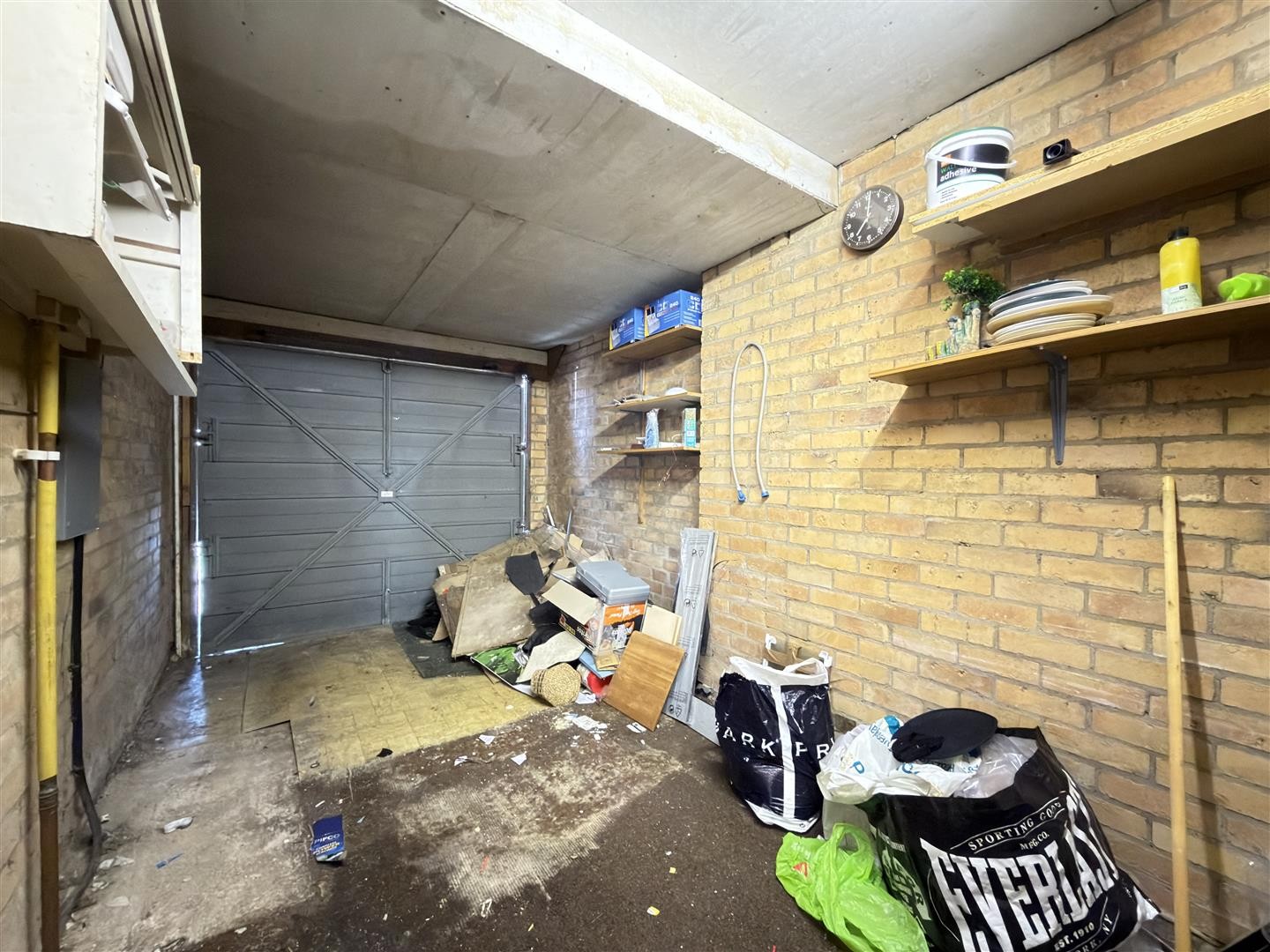 Concrete flooring, consumer unit and gas meter. Metal up-and-over door providing access to the outside.