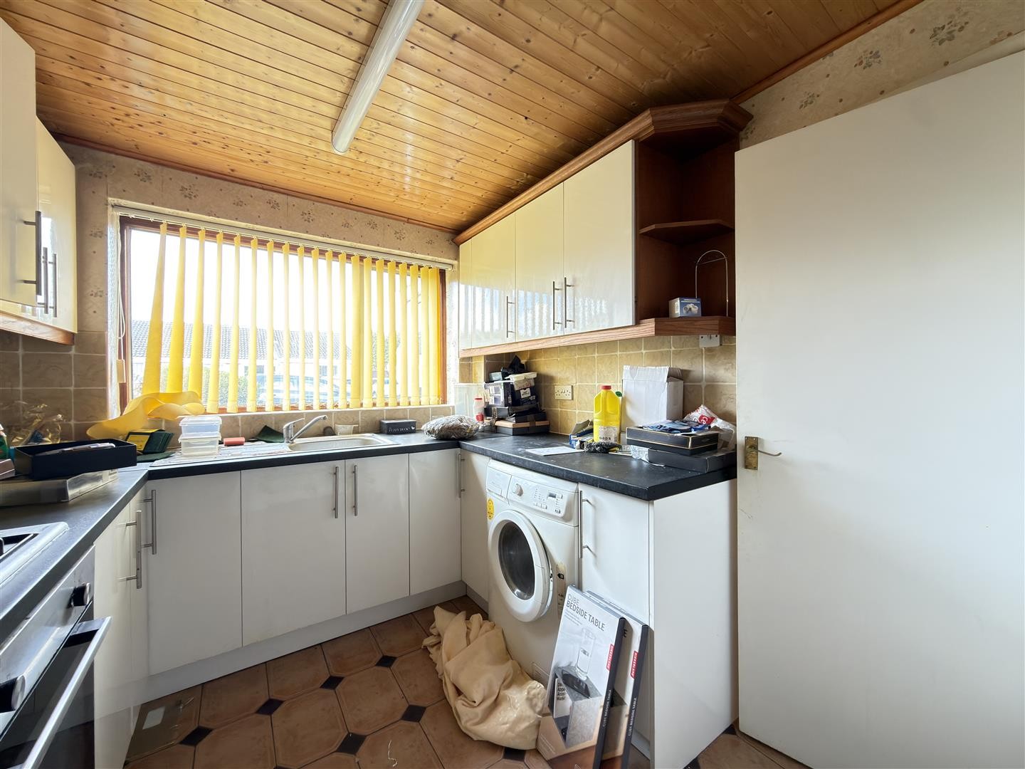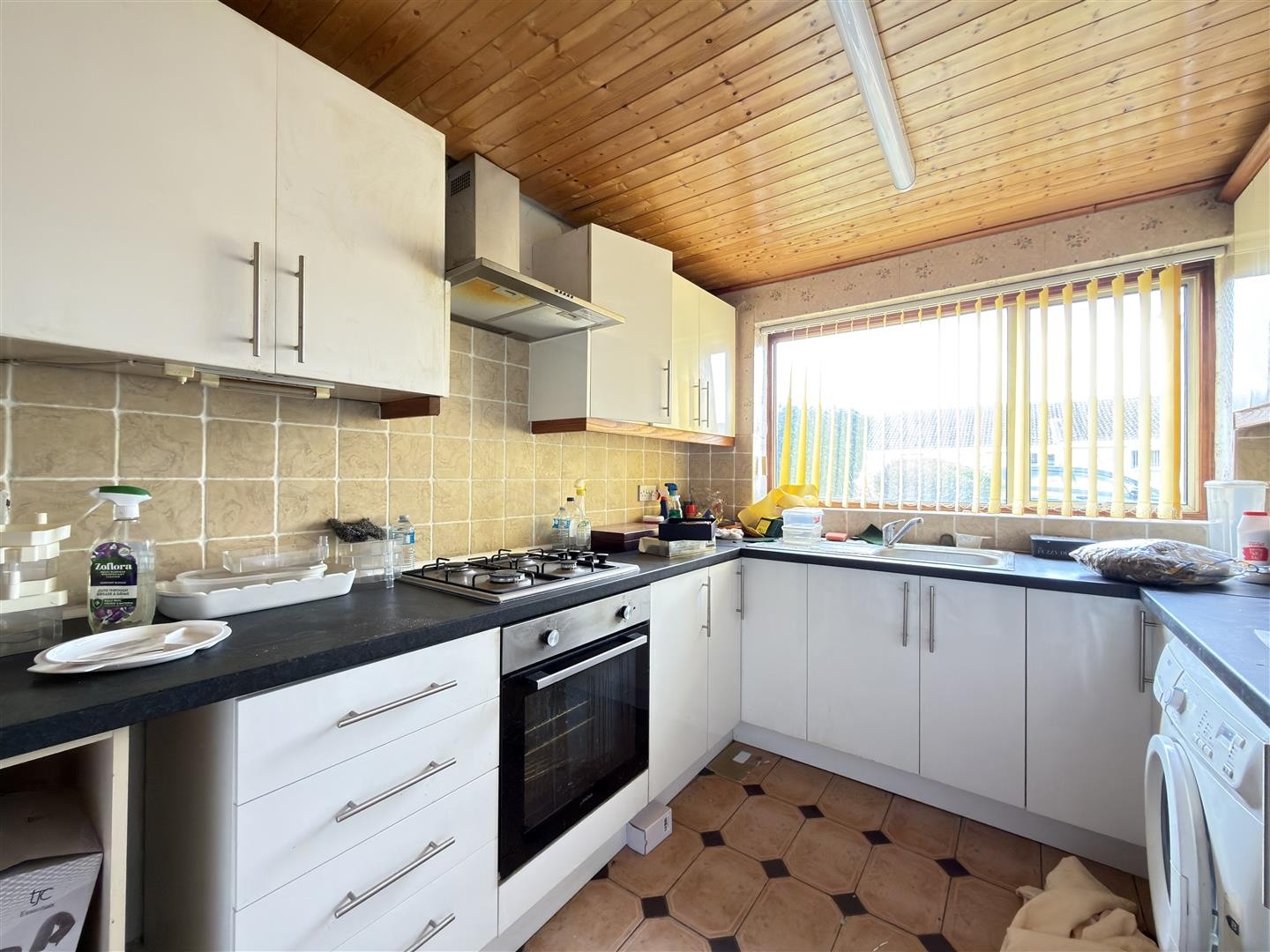 Tiled flooring, base and eye-level units, four-ring gas hob with oven and integrated extractor over, gas combination boiler, stainless steel sink, space and plumbing for washing machine, partially tiled walls, radiator, double-glazed window to the front aspect.