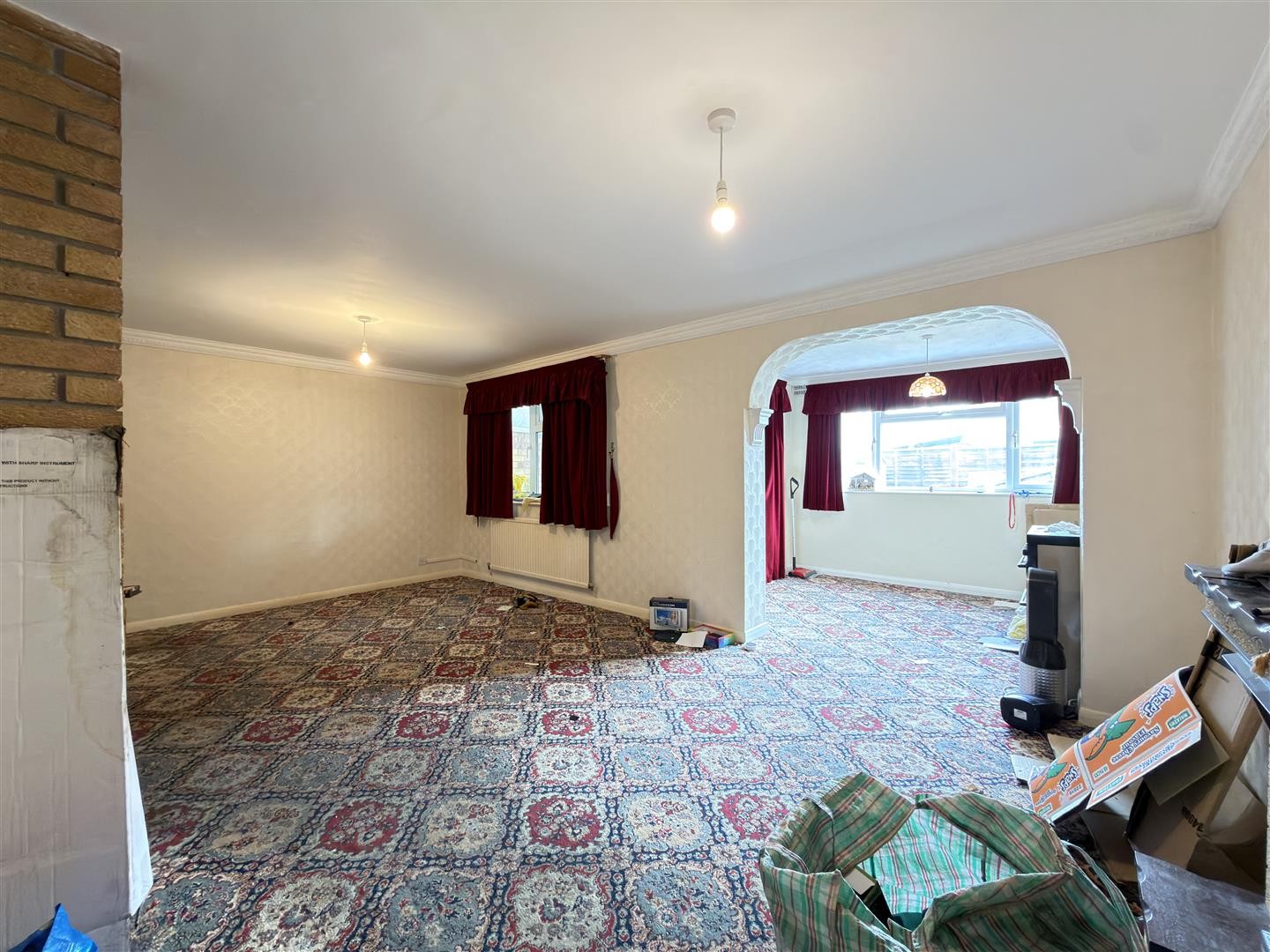 Carpeted flooring, two radiators, double-glazed window to the rear aspect. Stairs leading to the first floor. Open access through to the dining room.
