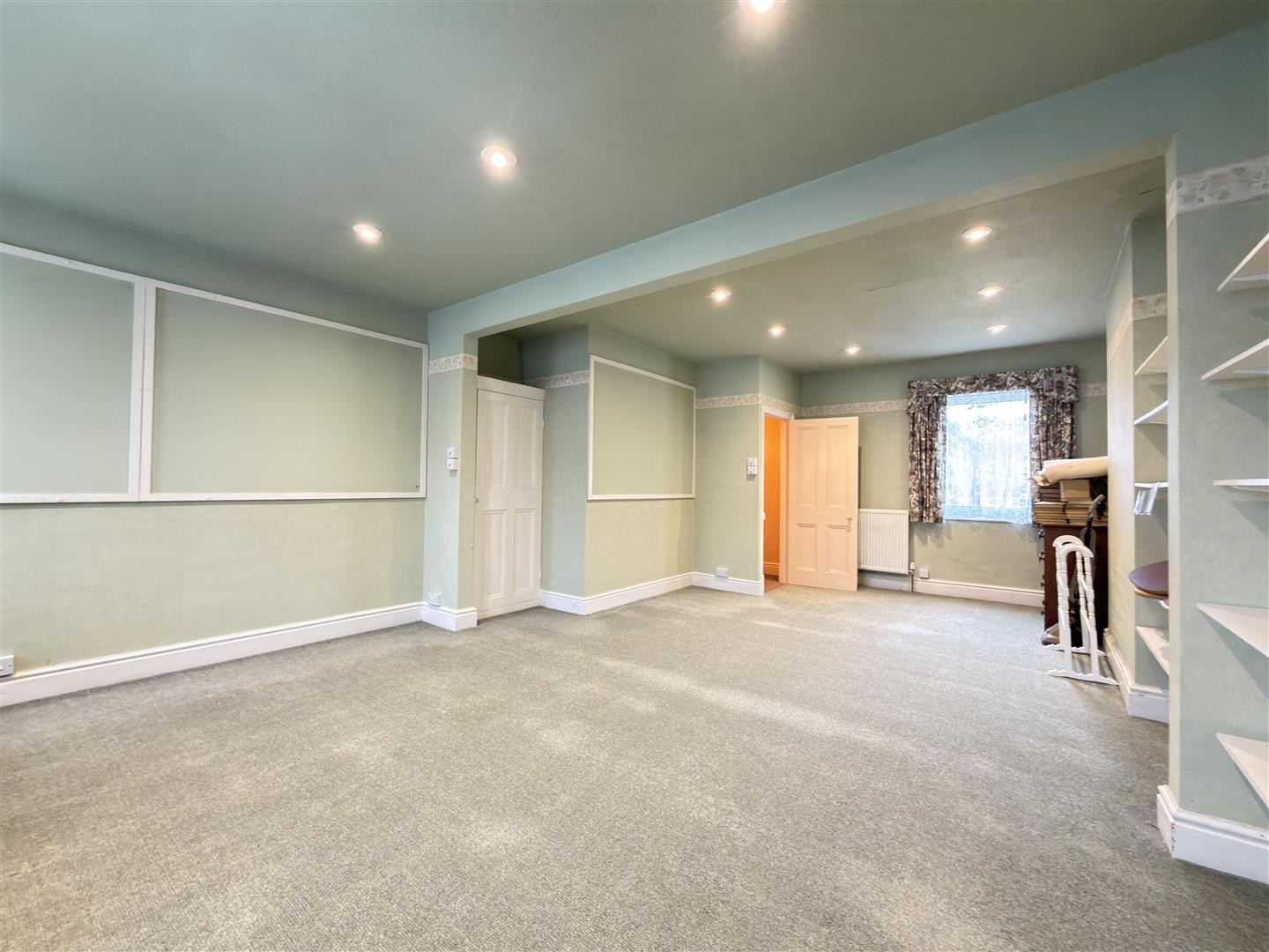 Carpeted flooring, radiator, gas fireplace, storage cupboard located beneath the stairs, additional storage cupboard with double-glazed window to the side aspect, double-glazed window to the side aspect. Provides access to the kitchen.