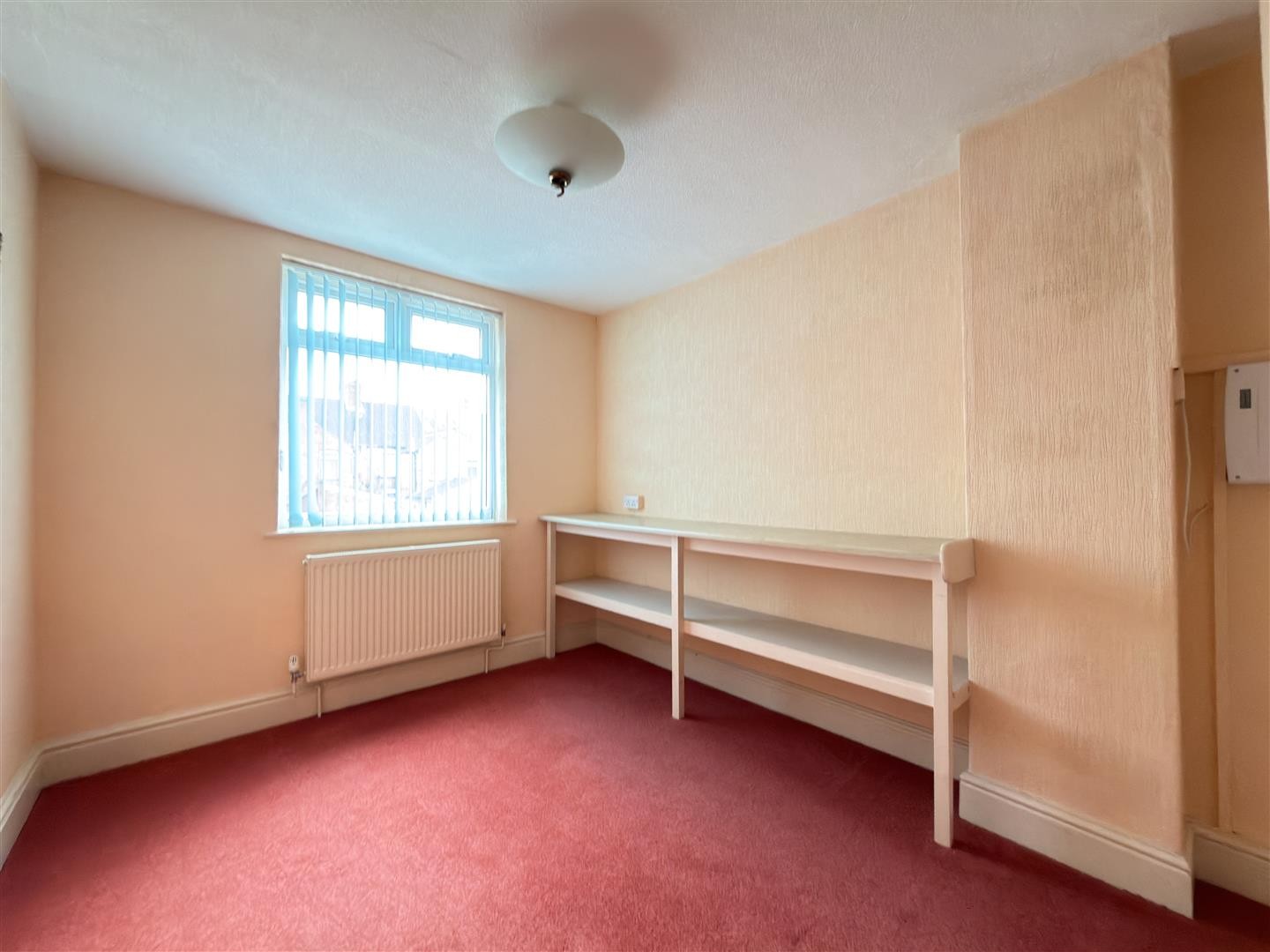 Carpeted flooring, two radiators, built-in storage cupboard, built-in desk with display shelving, double-glazed bay window to the front aspect.